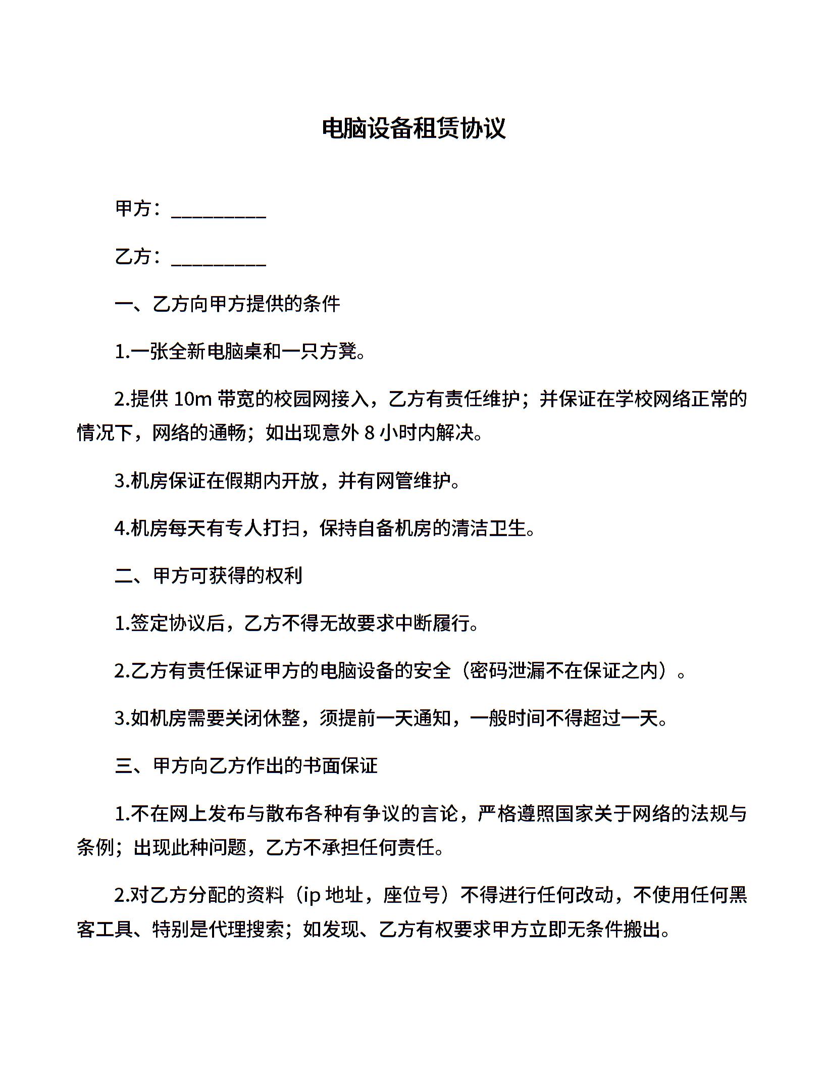 电脑设备租赁协议