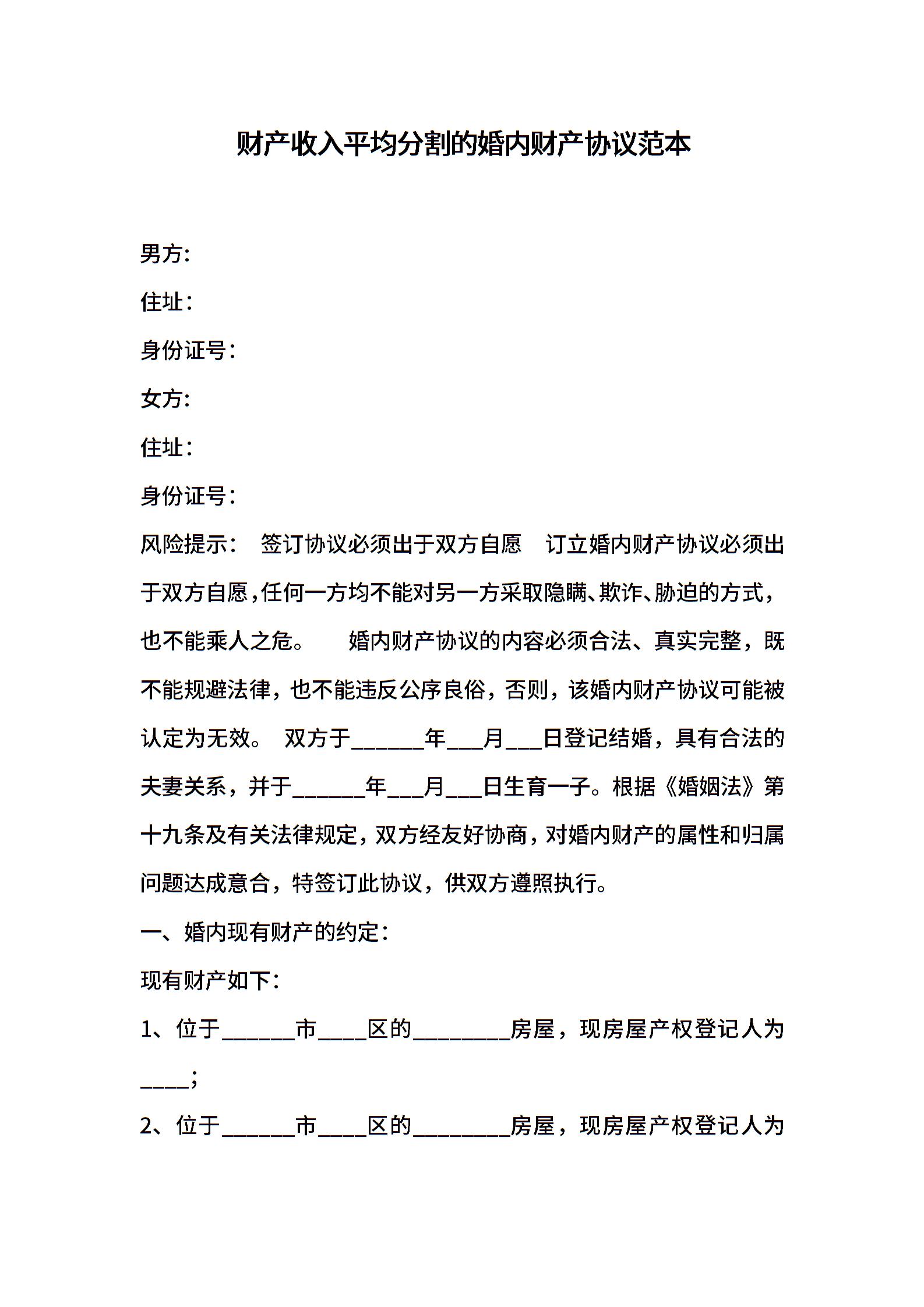 财产收入平均分割的婚内财产协议范本