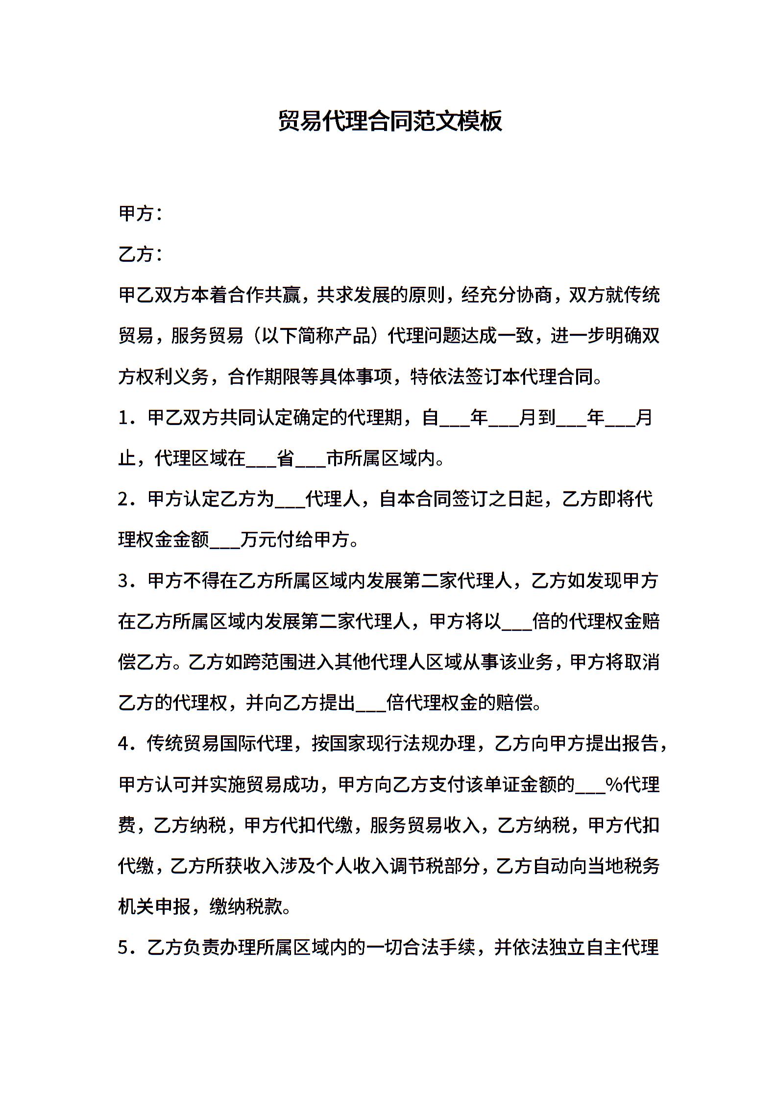 贸易代理合同范文模板