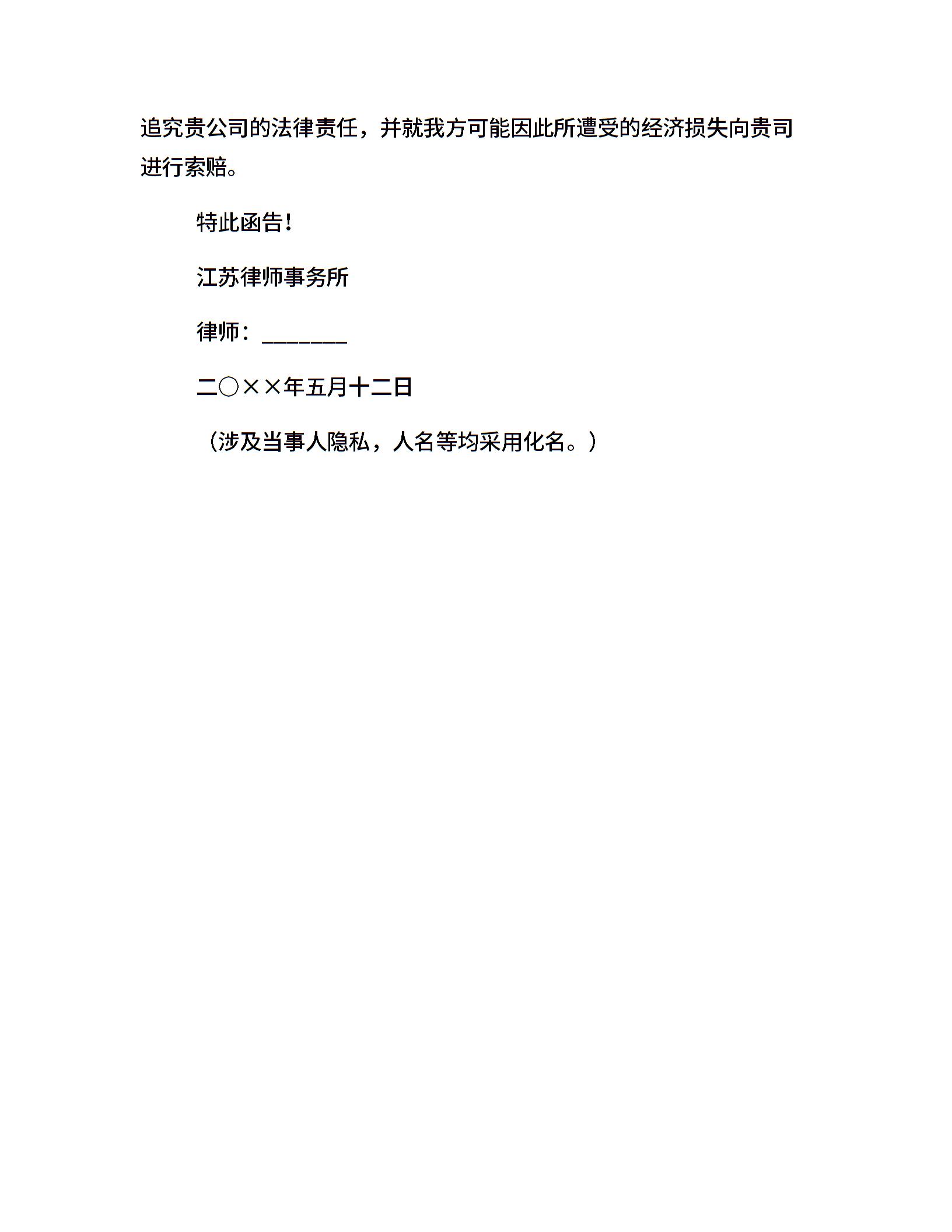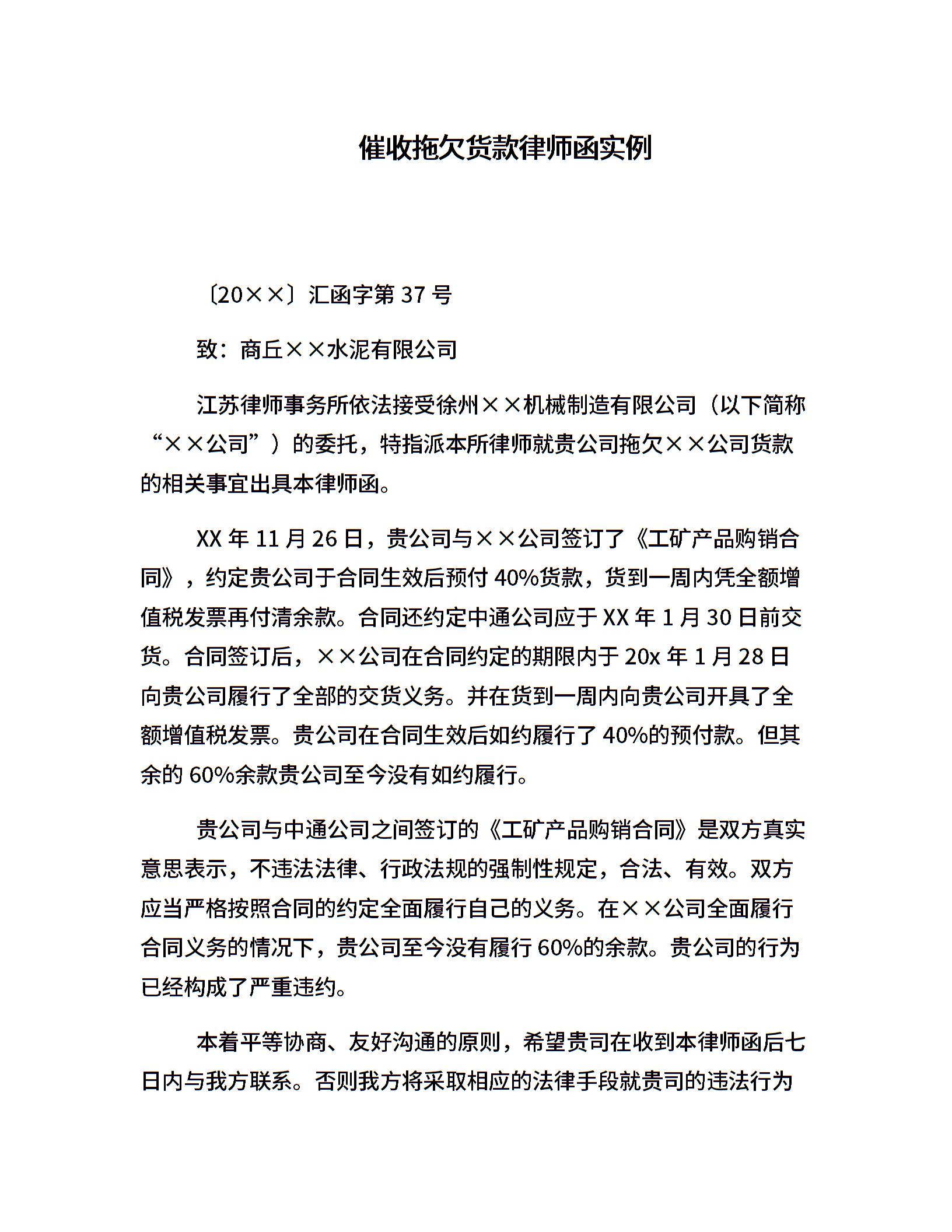催收拖欠货款律师函实例