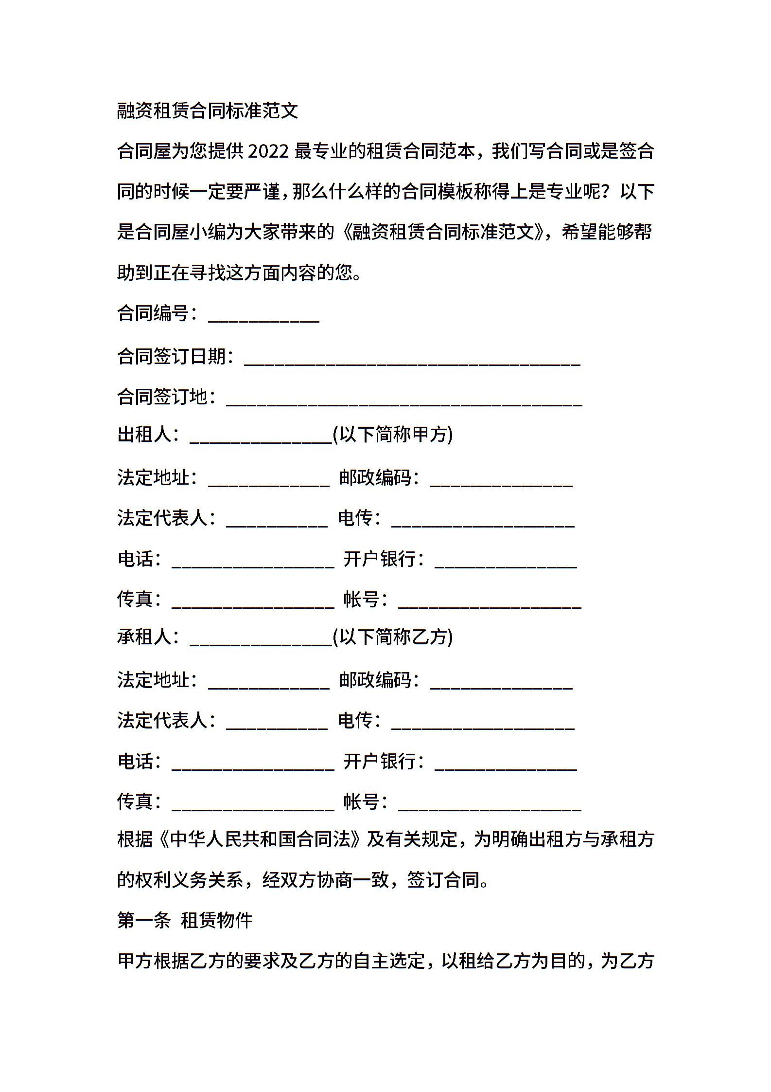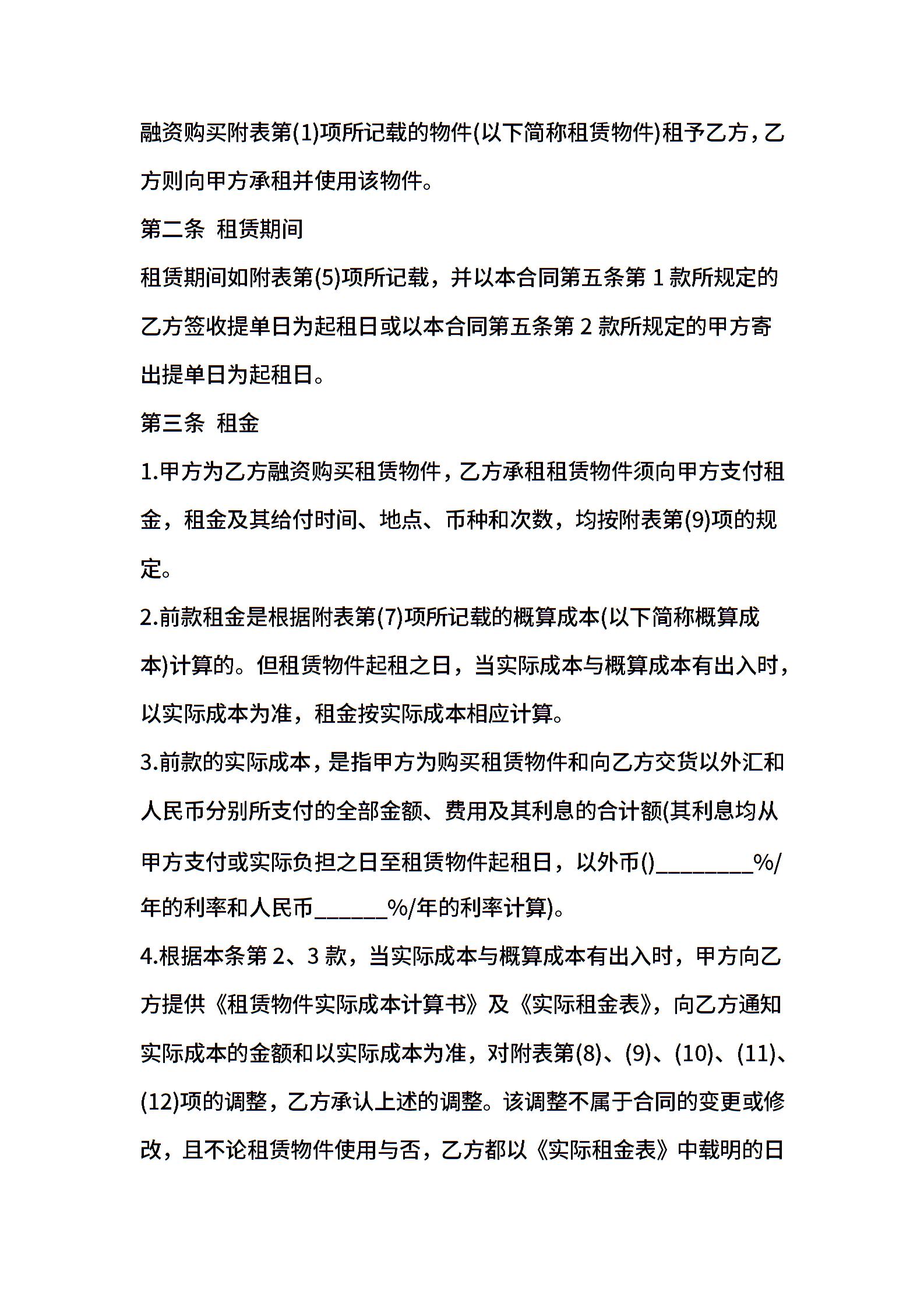 融资租赁合同标准范文
