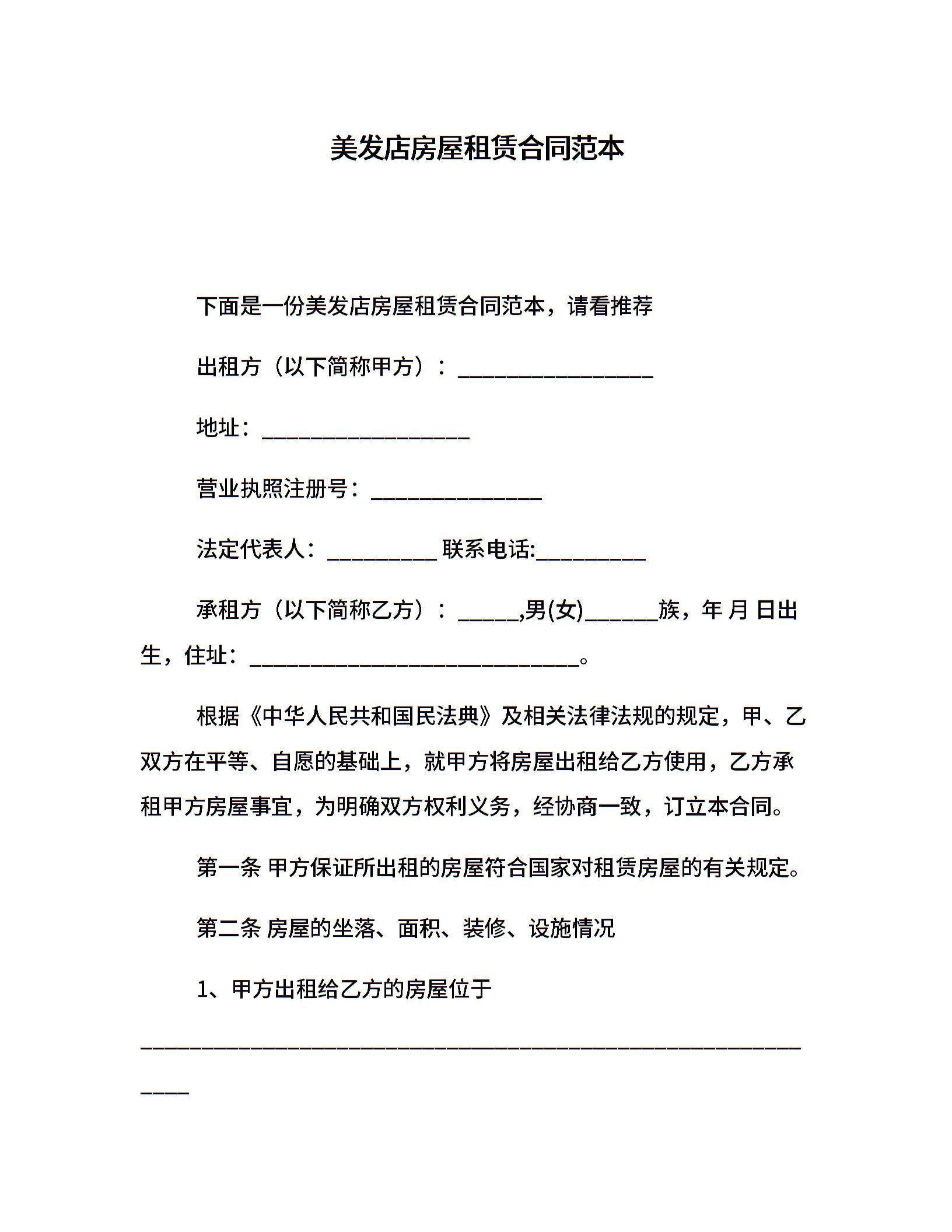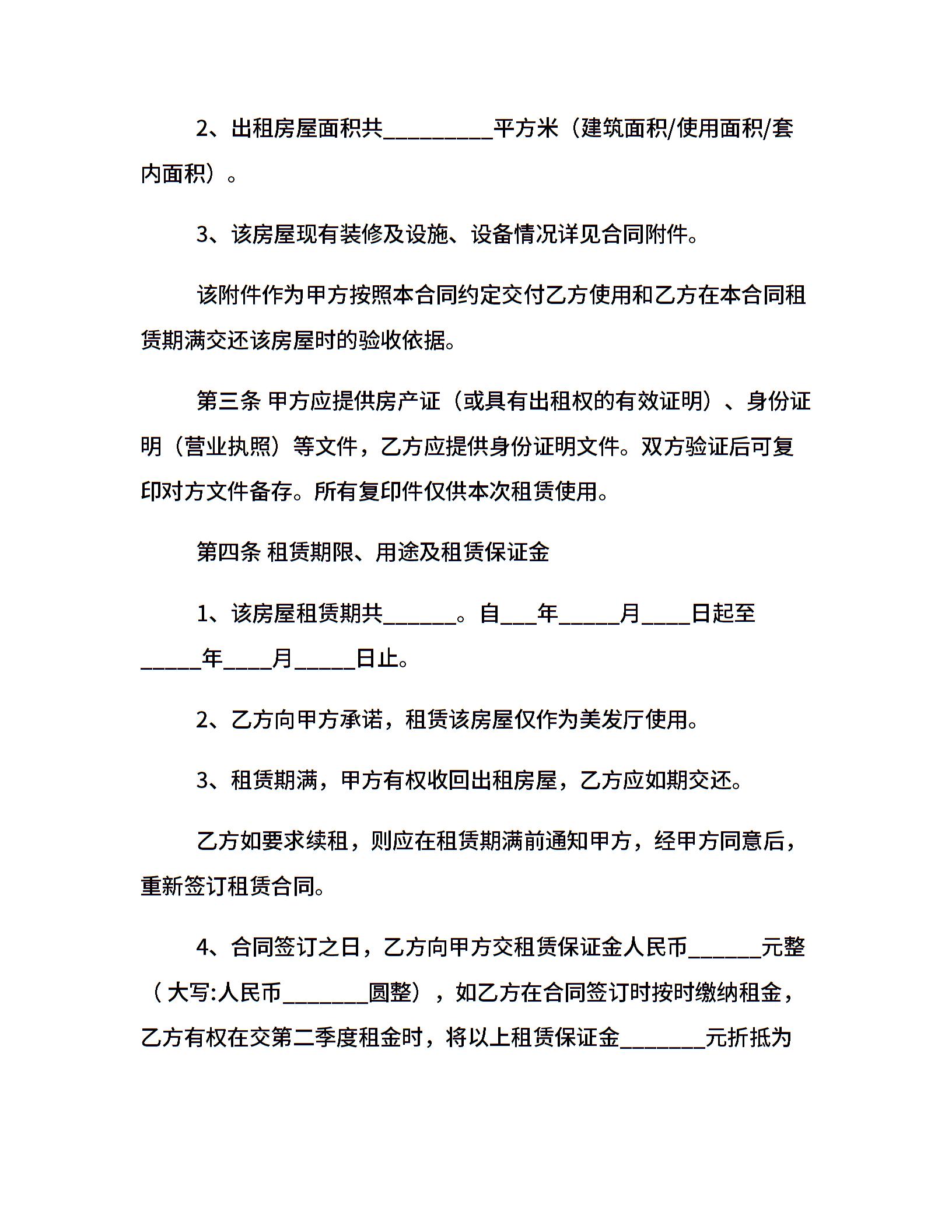 美发店房屋租赁合同范本