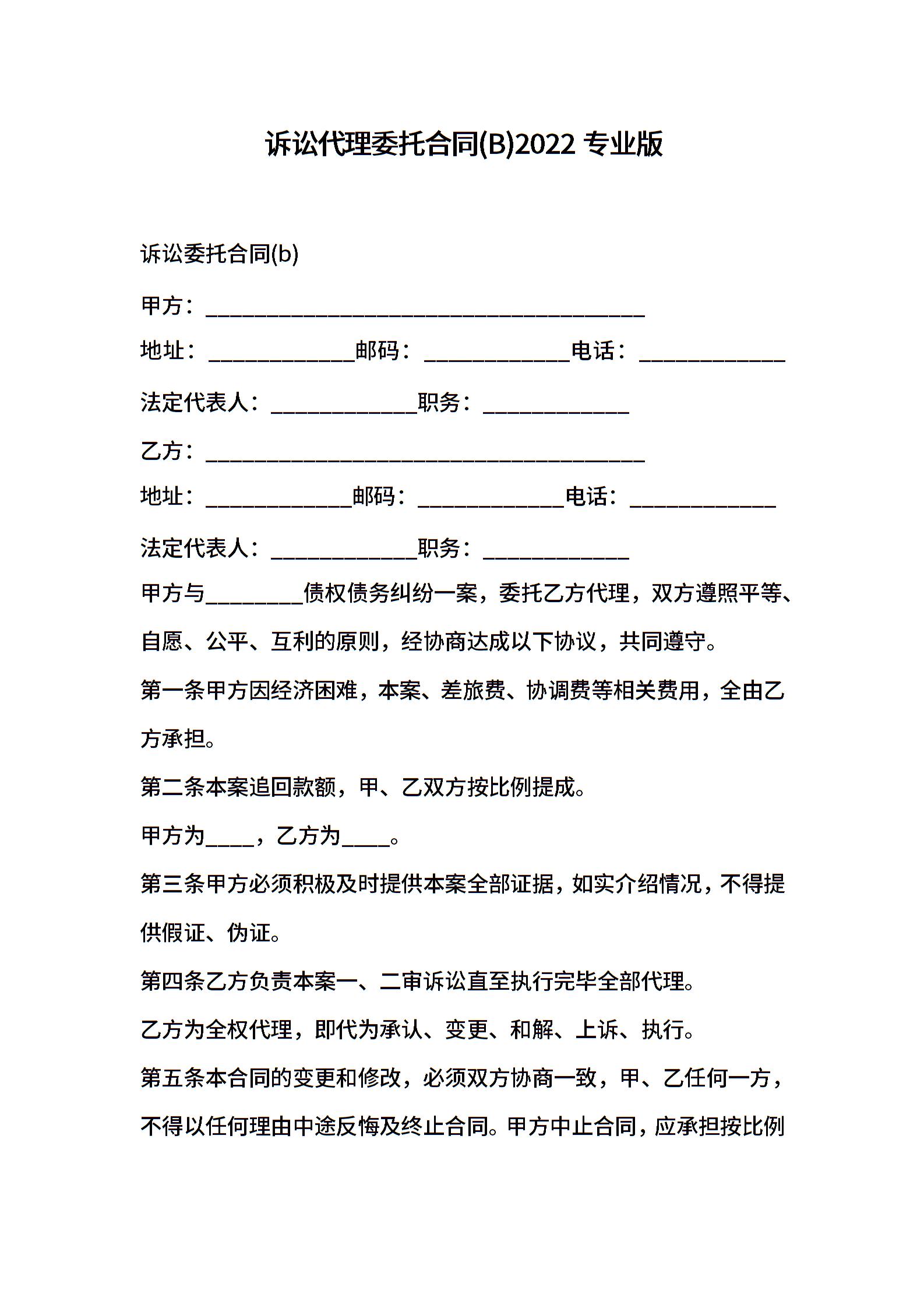 诉讼代理委托合同(B)2022专业版
