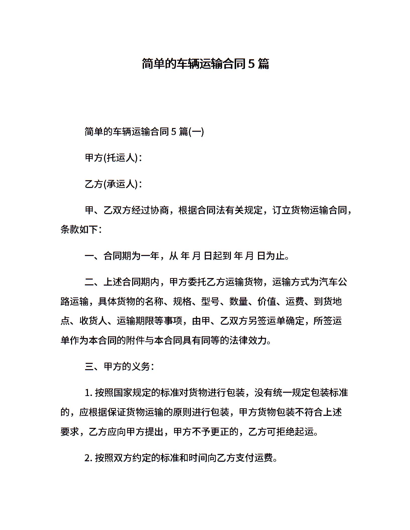 简单的车辆运输合同5篇