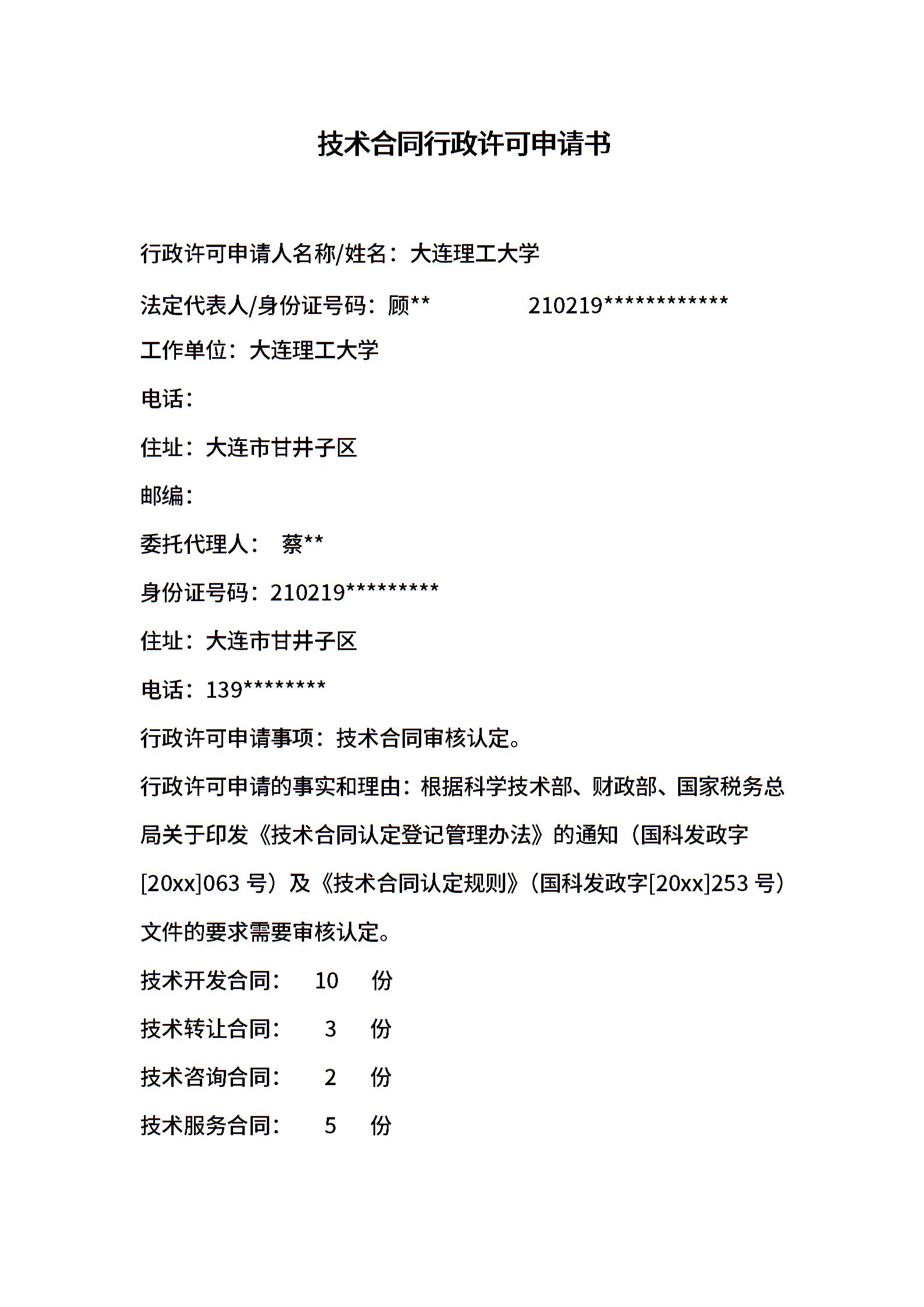 技术合同行政许可申请书