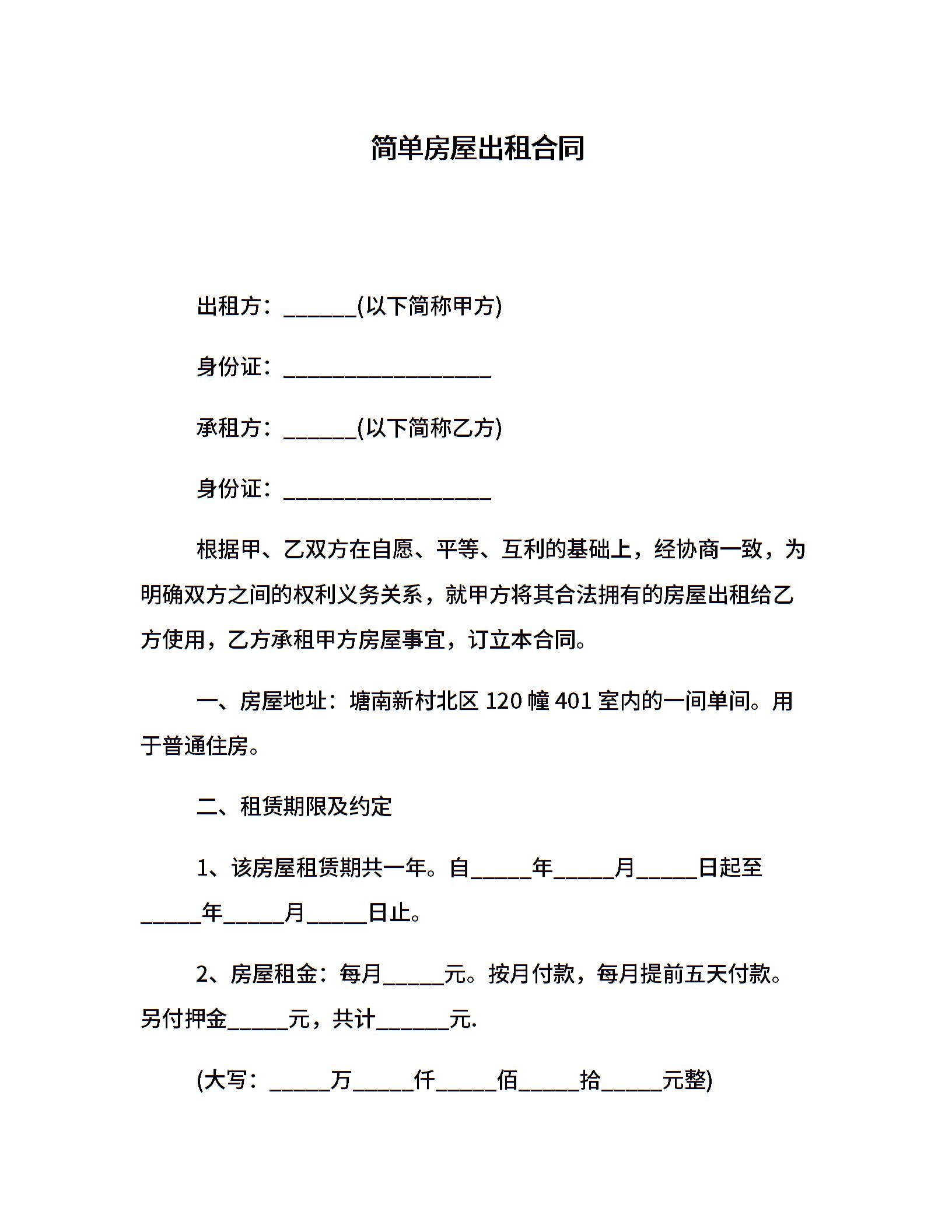 简单房屋出租合同