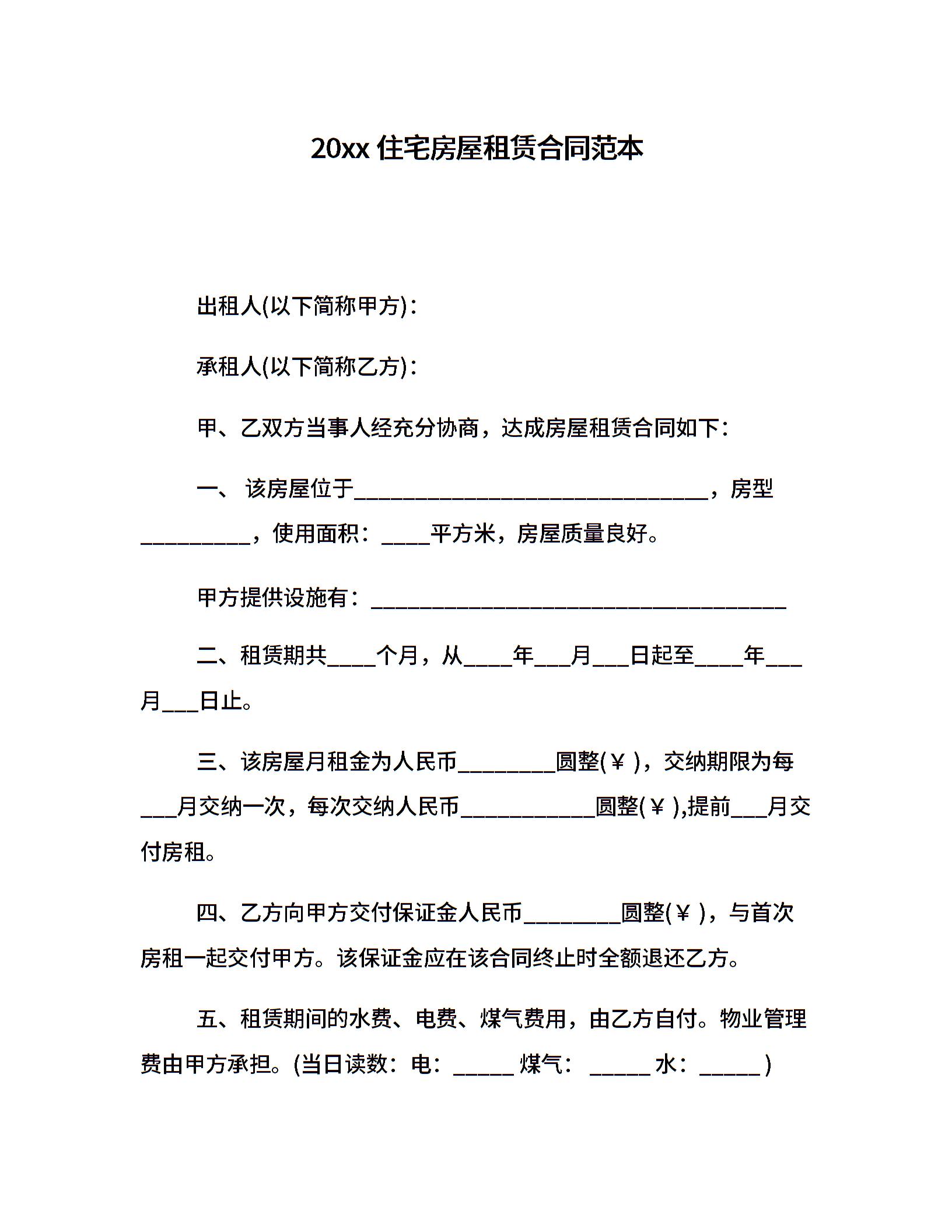 20xx住宅房屋租赁合同范本