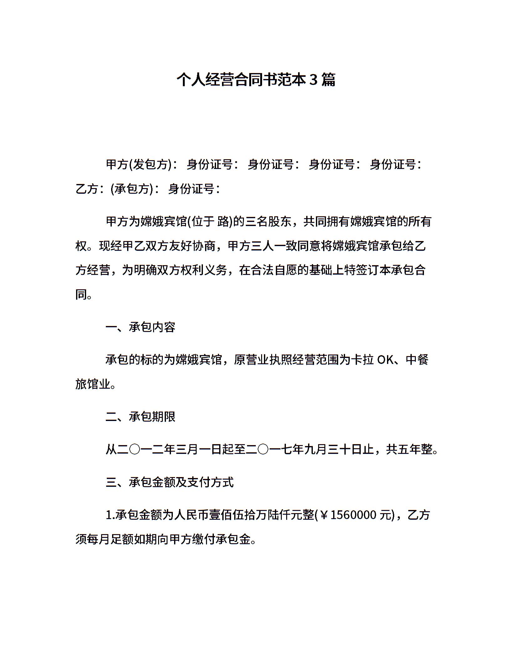 个人经营合同书范本3篇