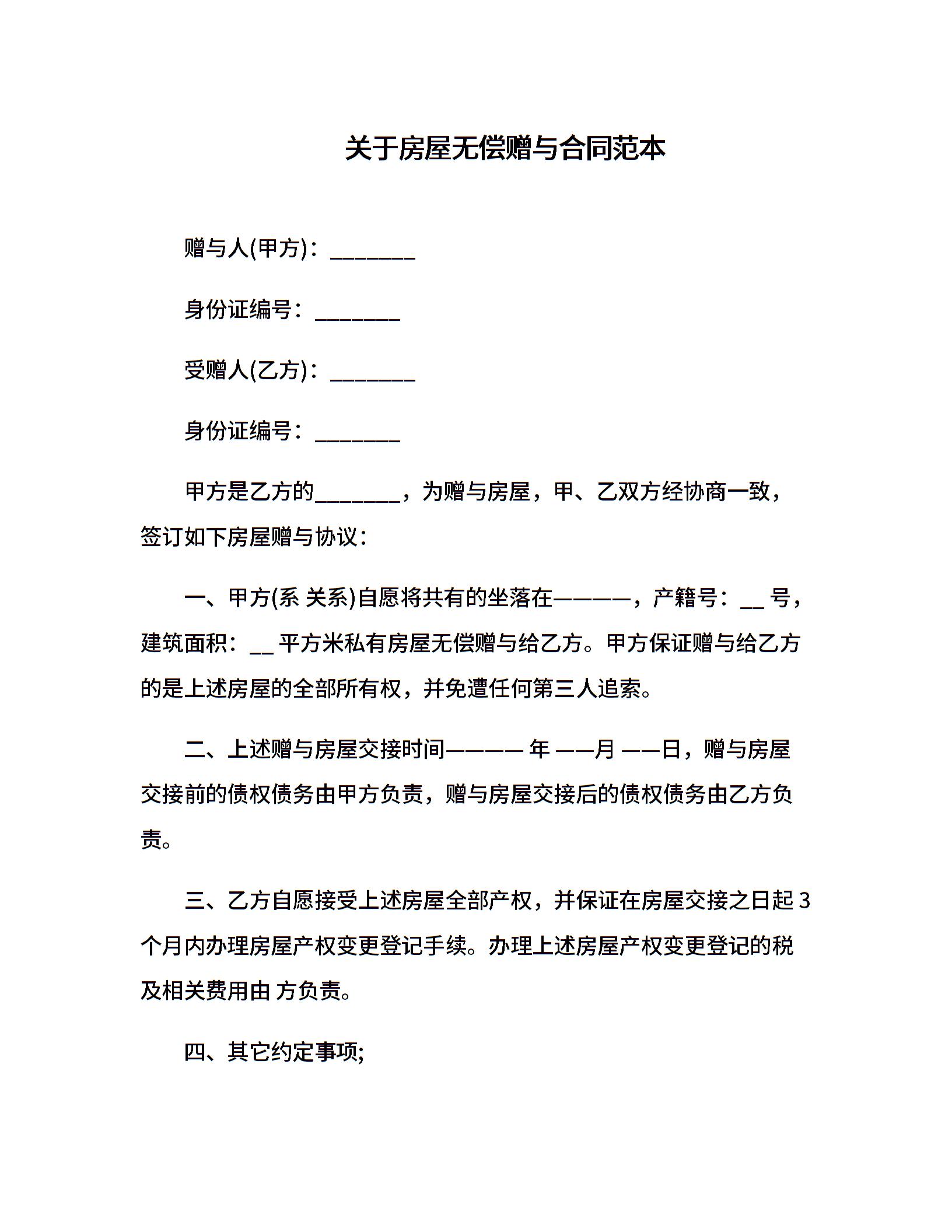 关于房屋无偿赠与合同范本