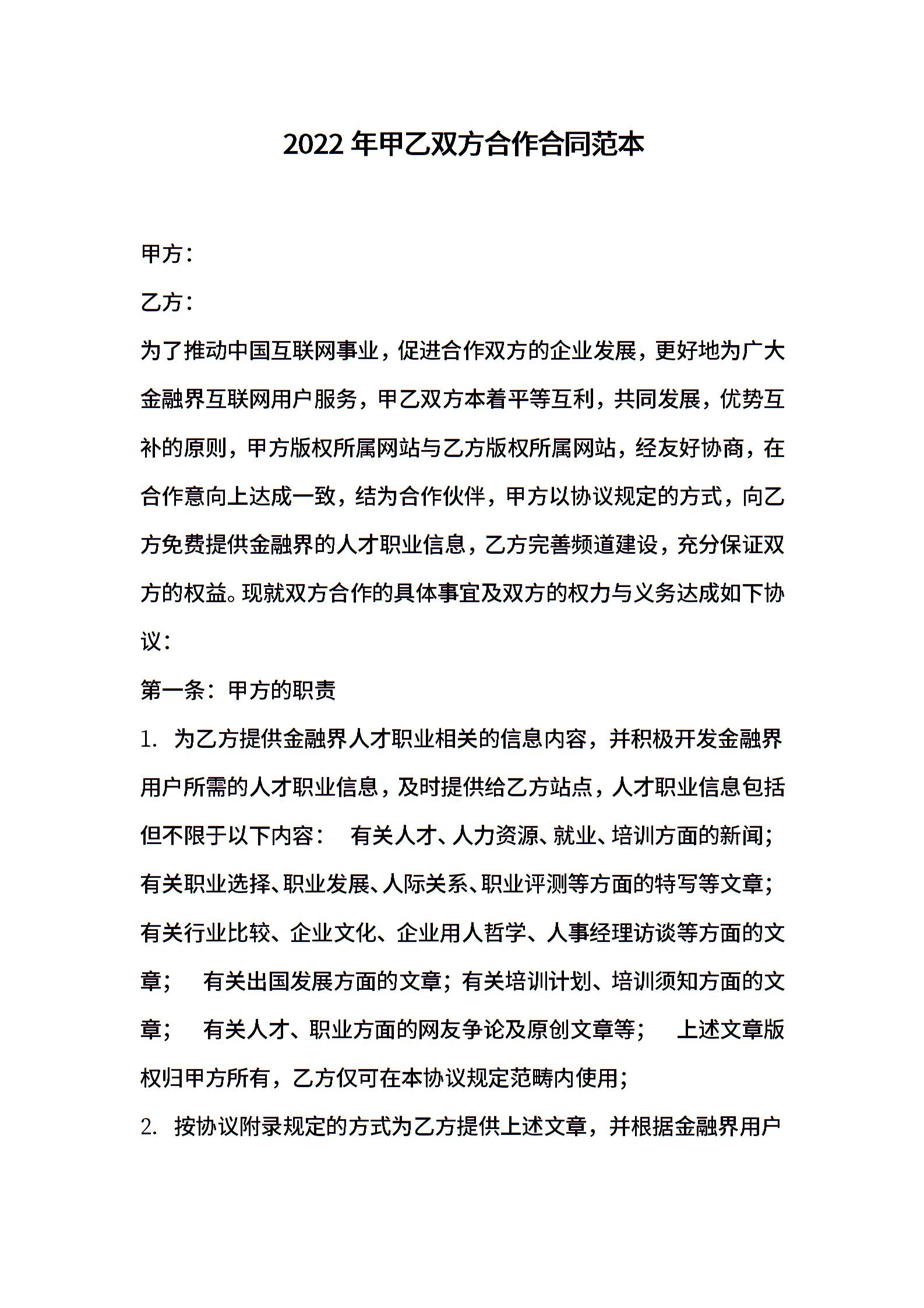 2022年甲乙双方合作合同范本
