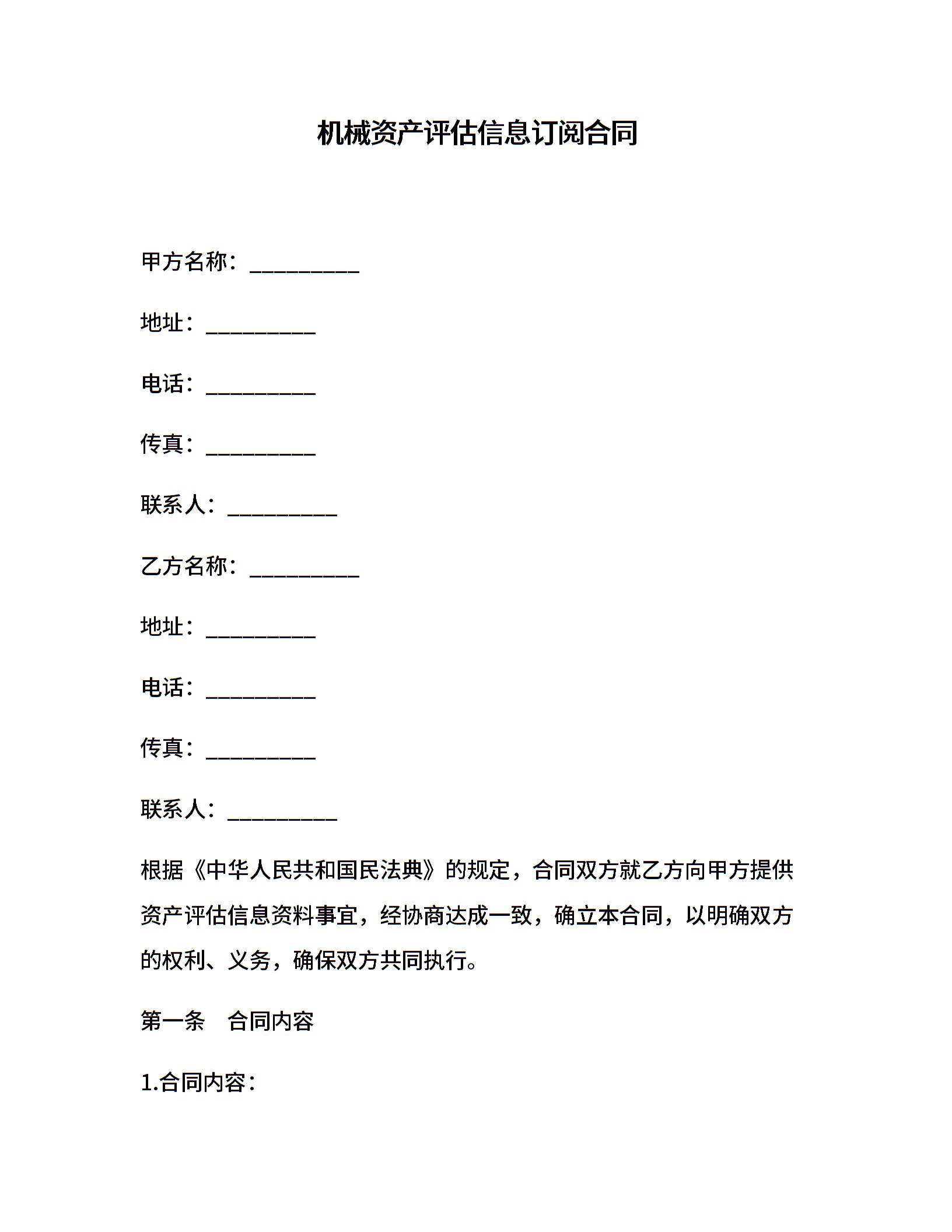 机械资产评估信息订阅合同