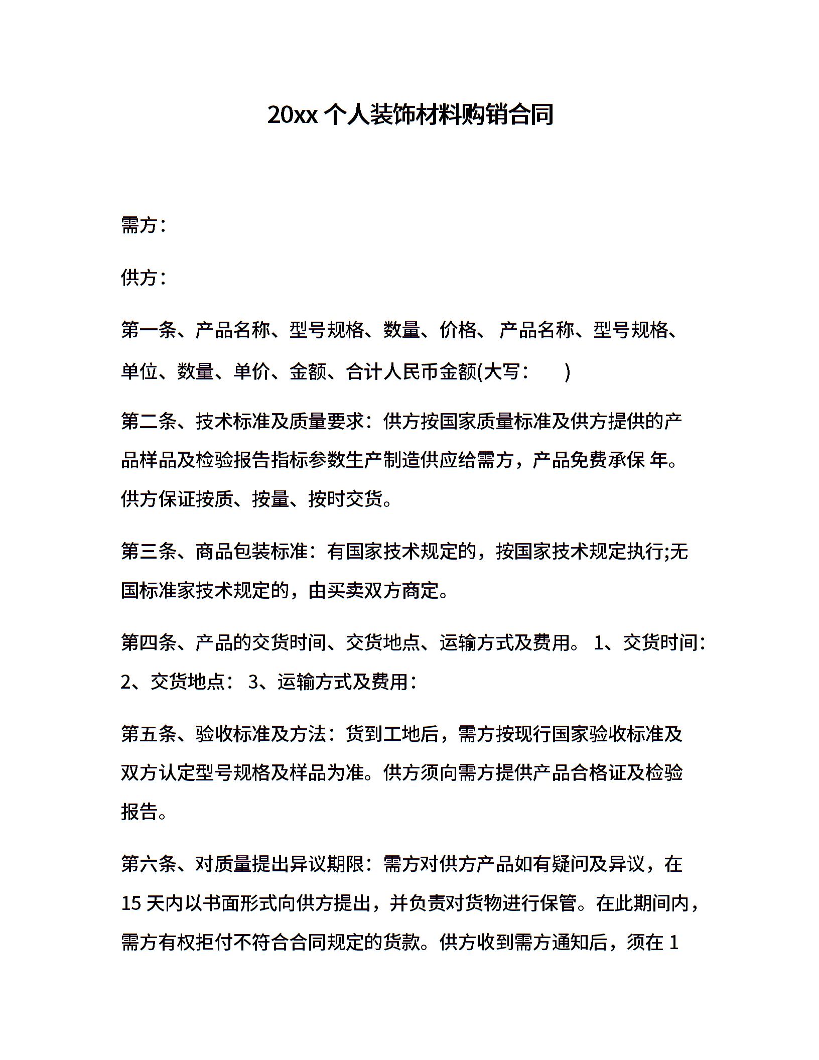 20xx个人装饰材料购销合同