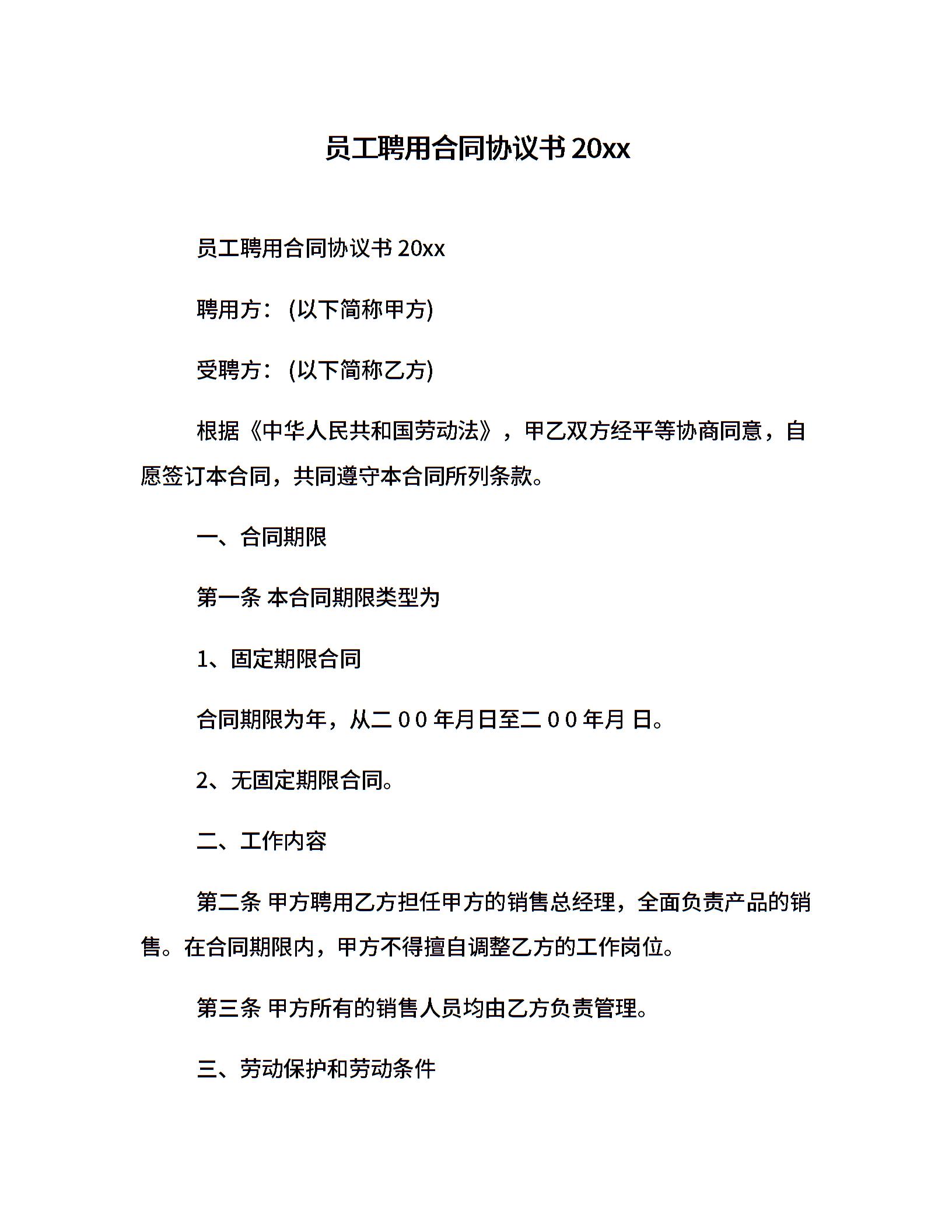 员工聘用合同协议书20xx