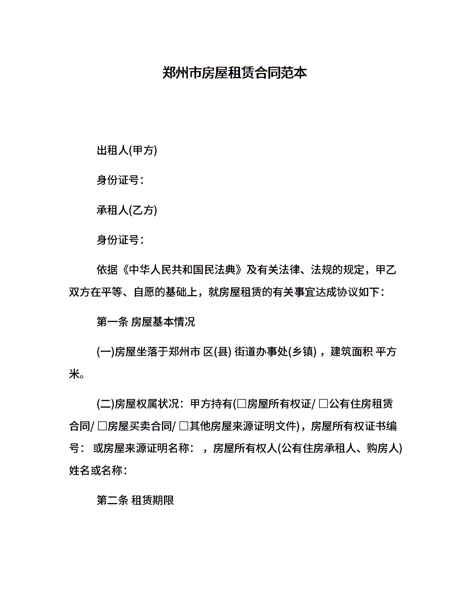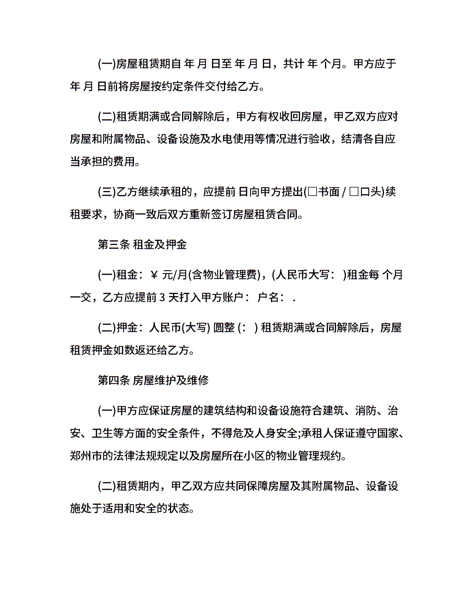 郑州市房屋租赁合同范本