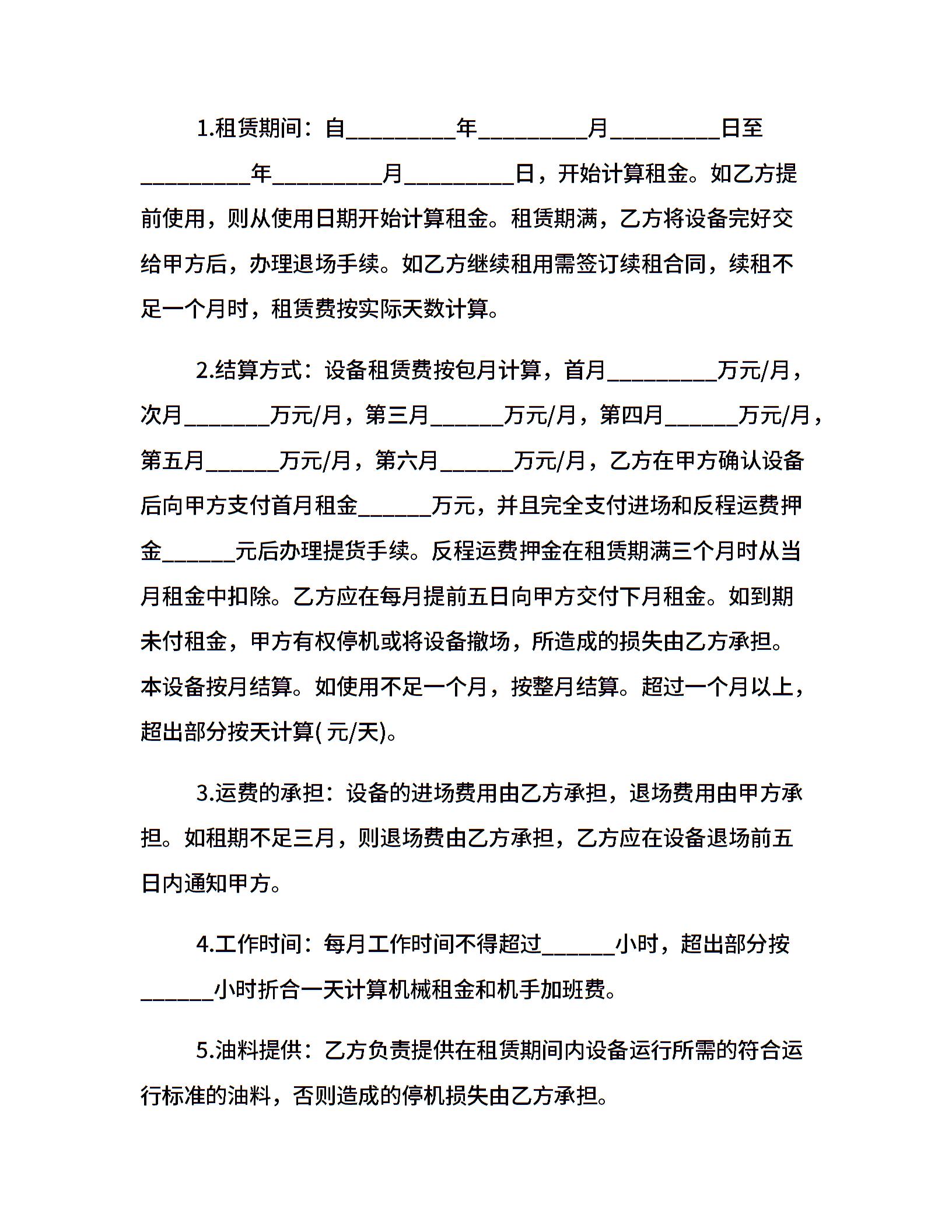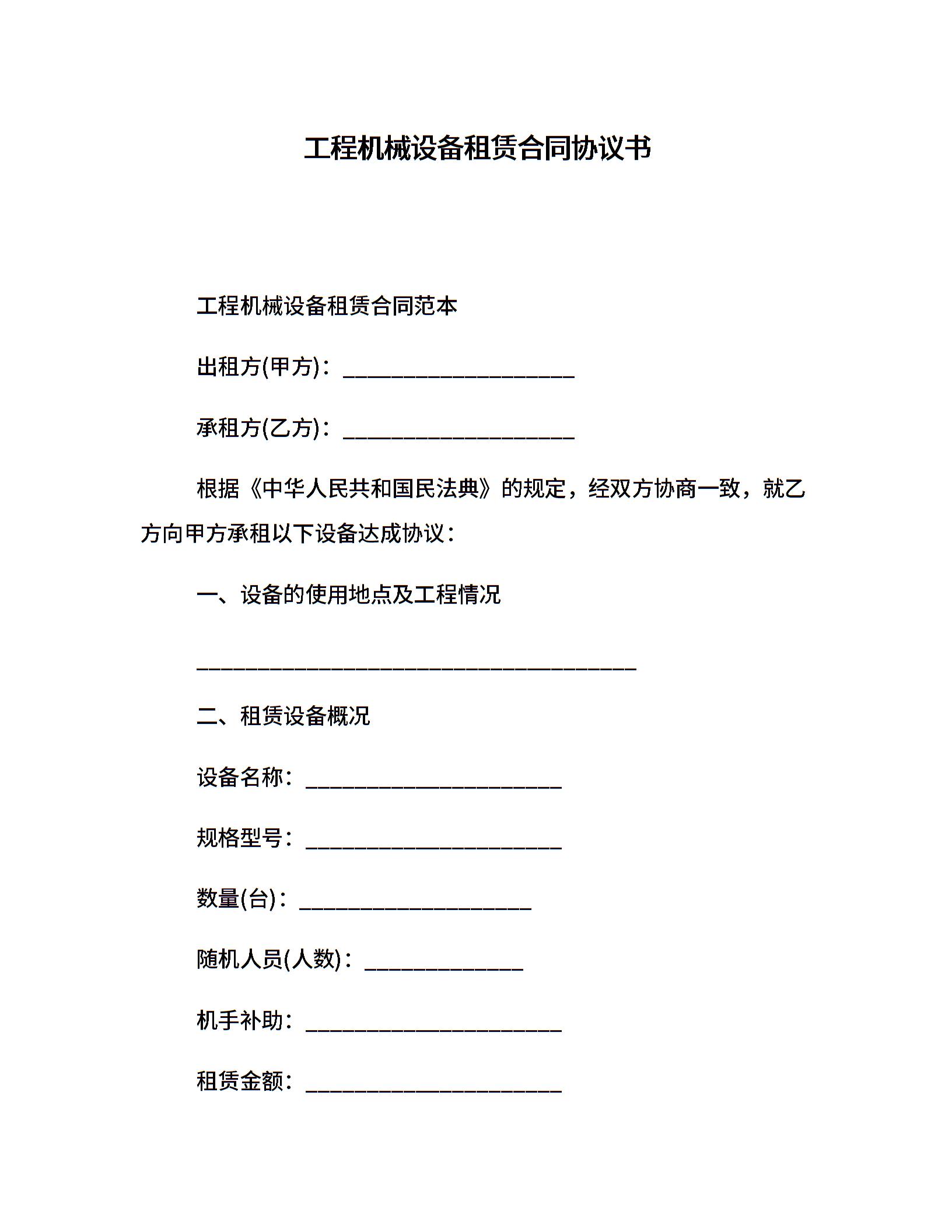 工程机械设备租赁合同协议书