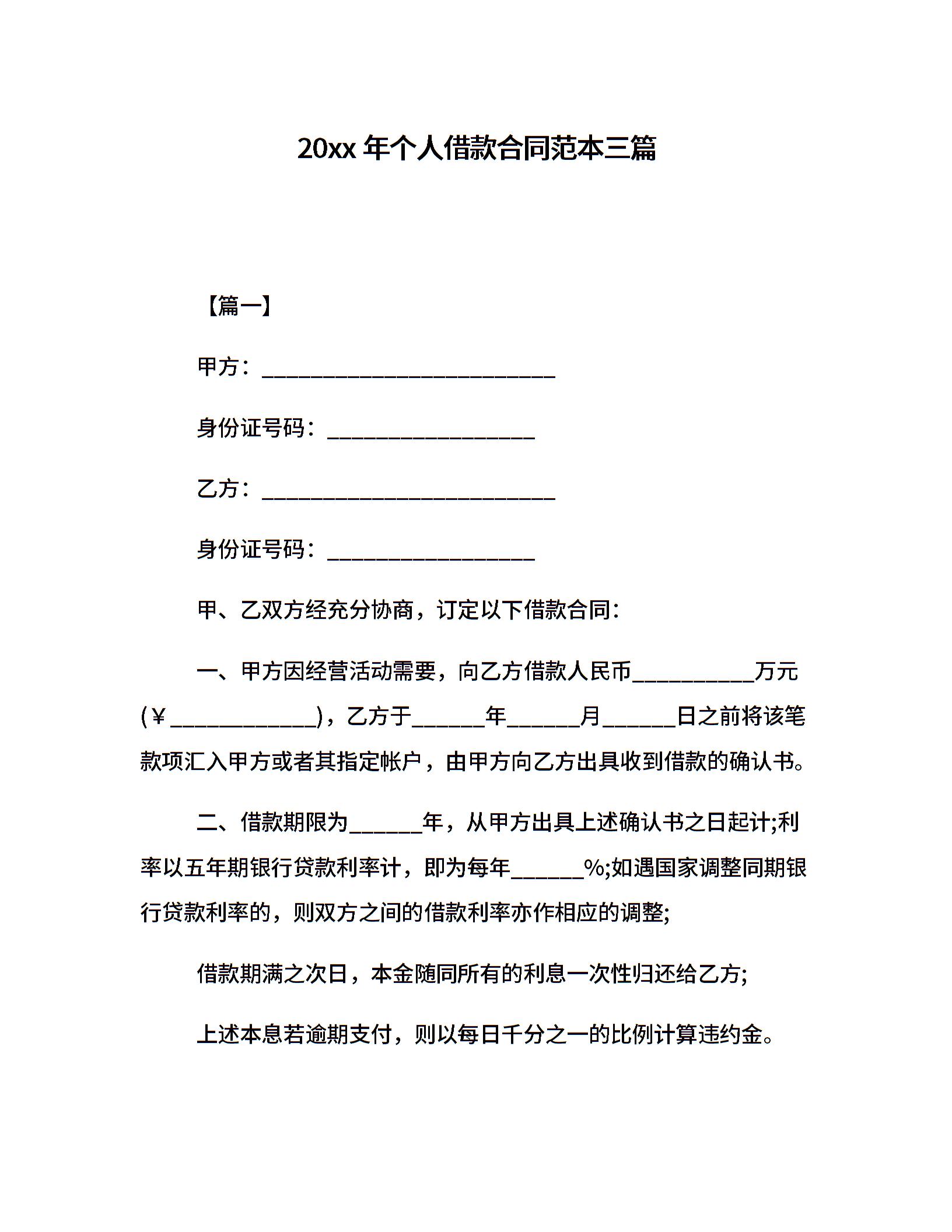 20xx年个人借款合同范本三篇