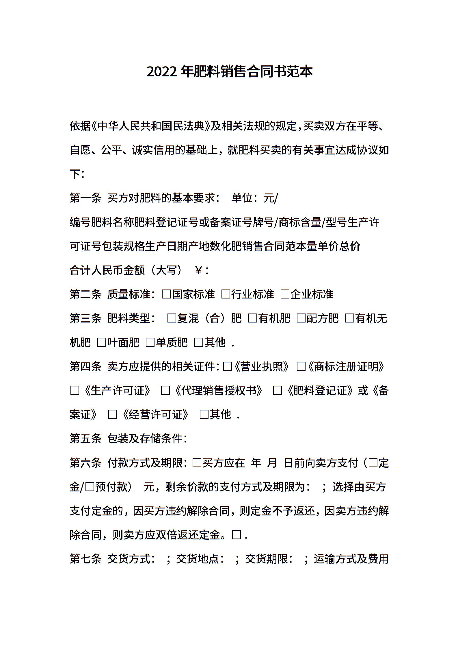 2022年肥料销售合同书范本