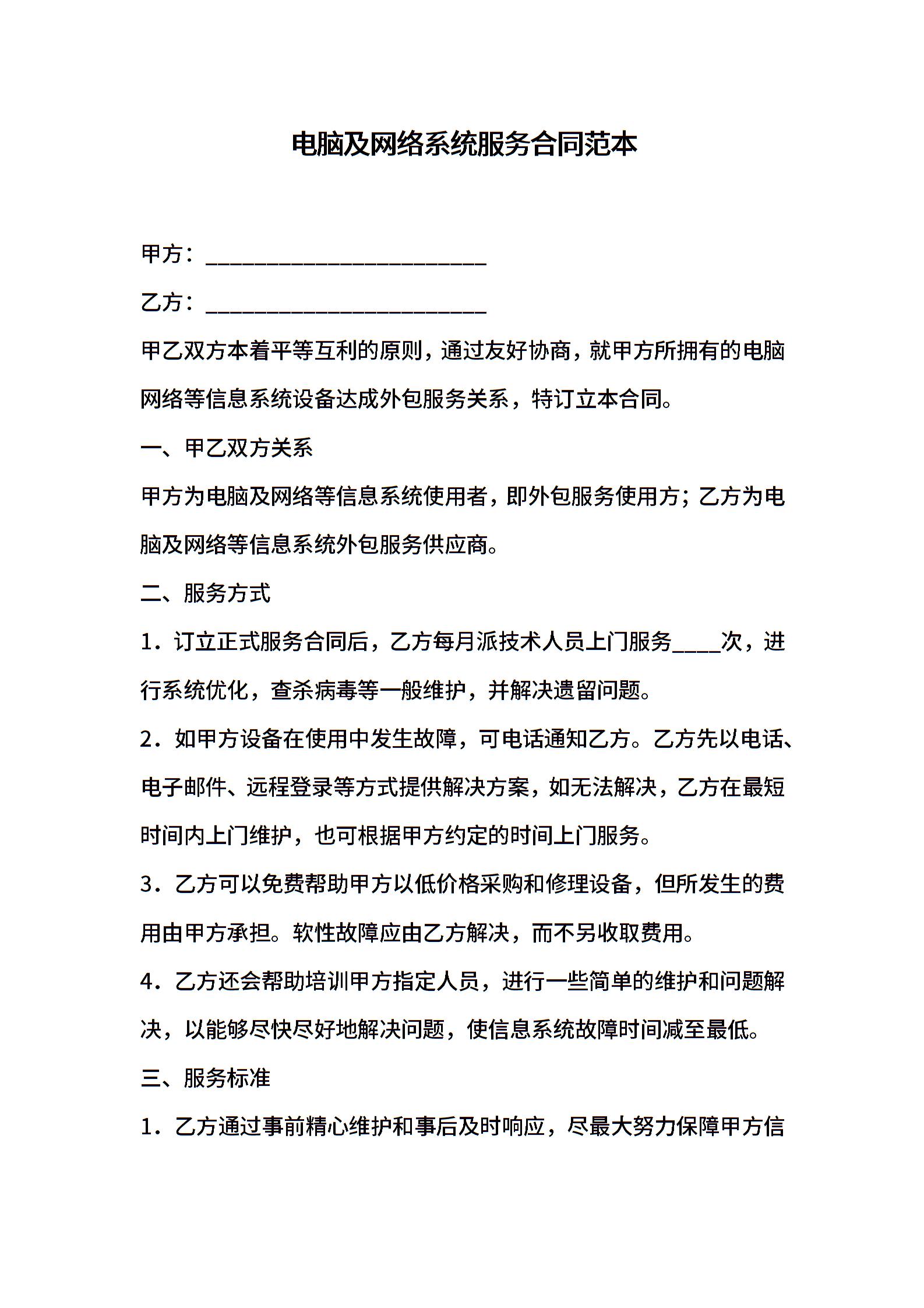 电脑及网络系统服务合同范本