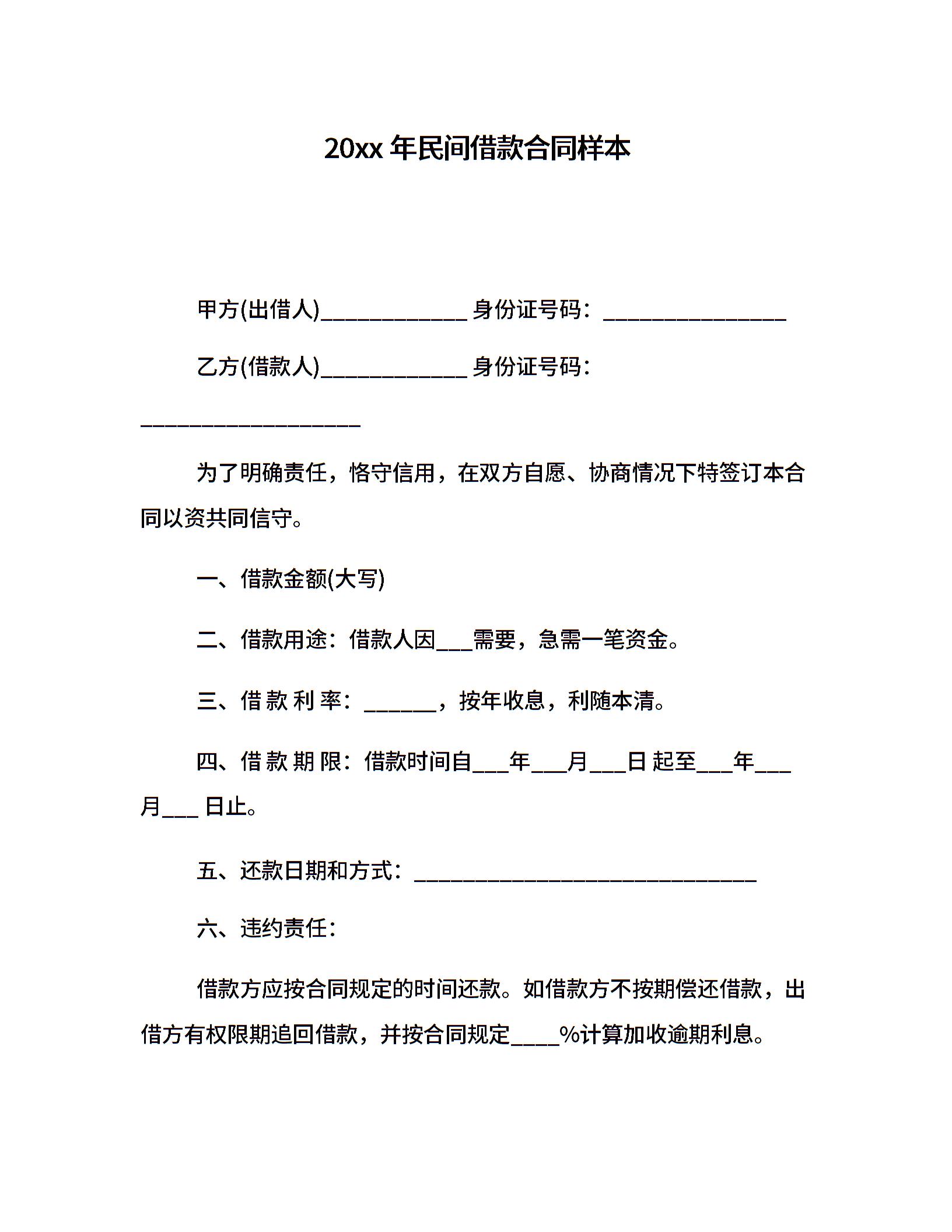 20xx年民间借款合同样本