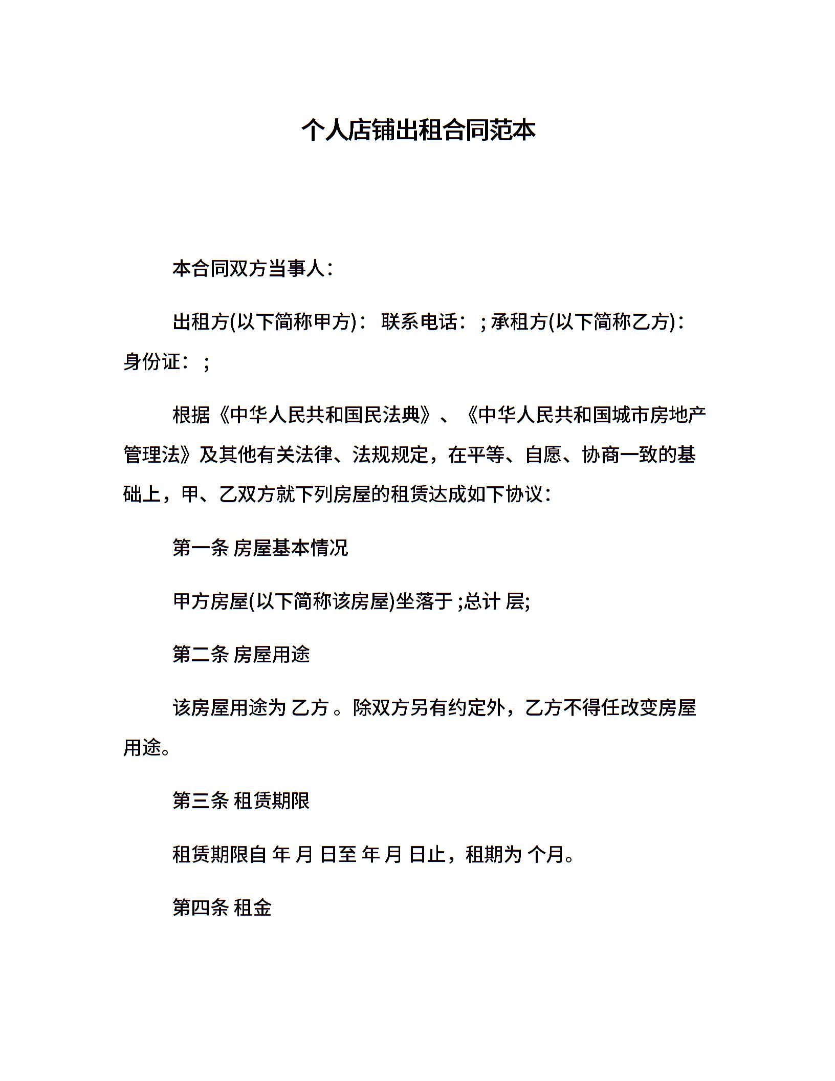 个人店铺出租合同范本