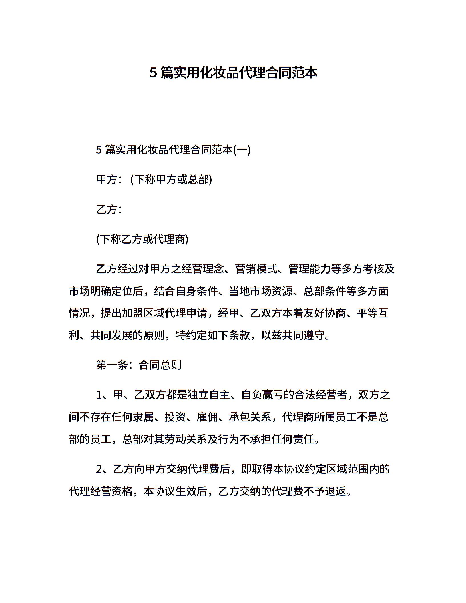 5篇实用化妆品代理合同范本