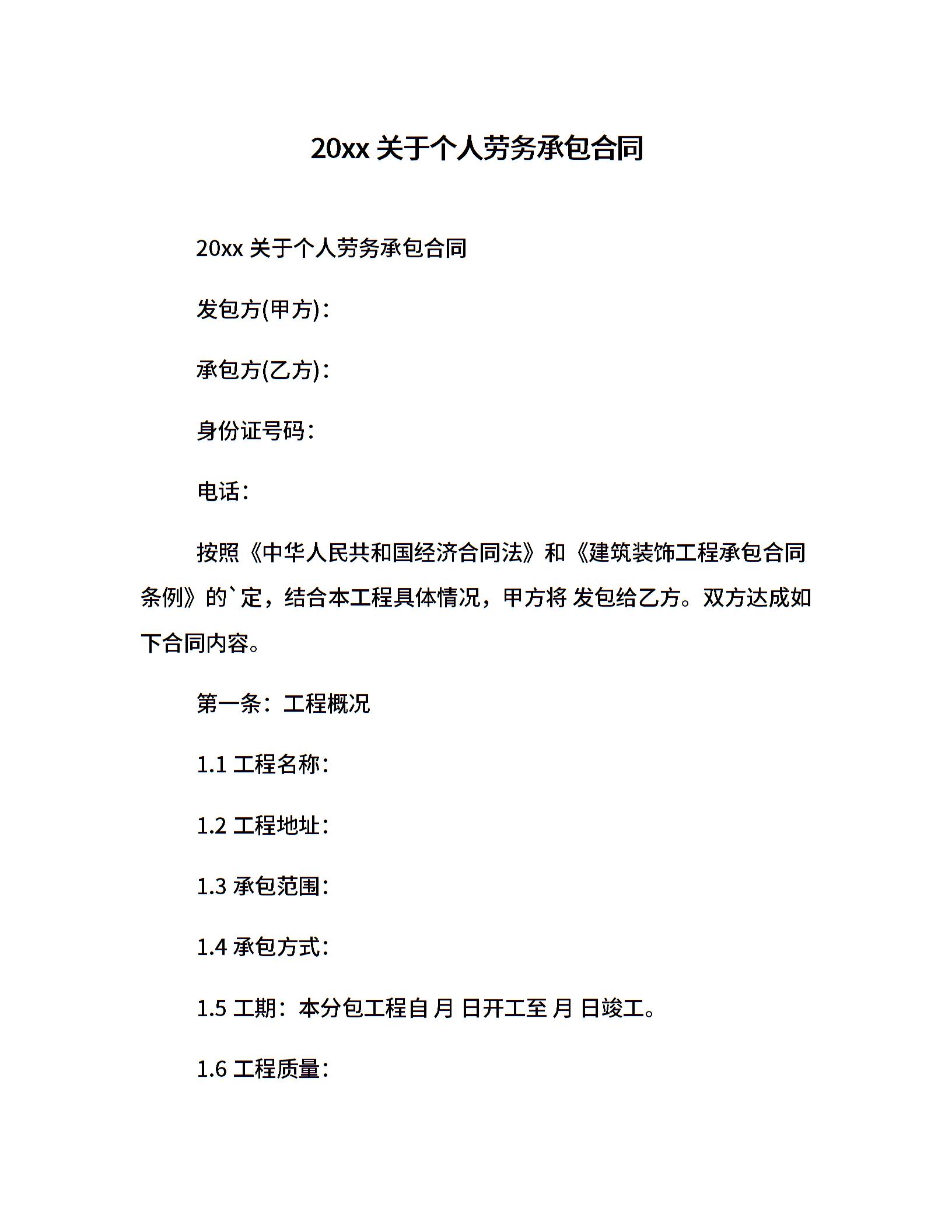 20xx关于个人劳务承包合同