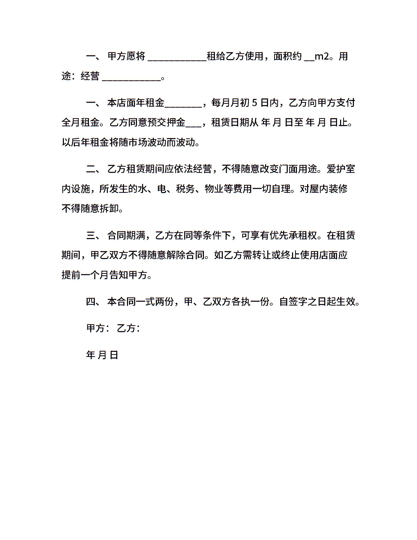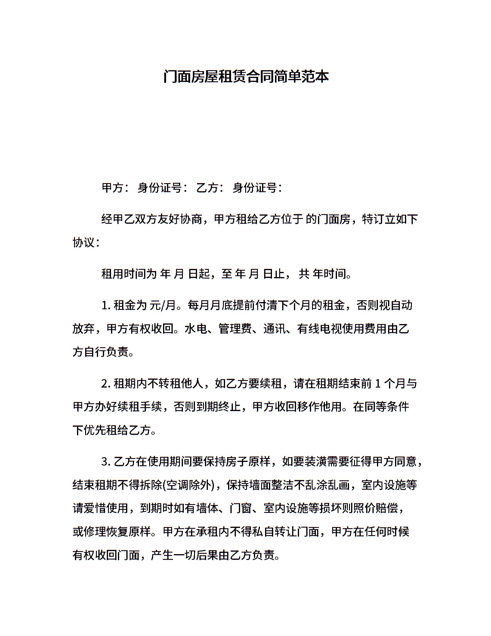 门面房屋租赁合同简单范本