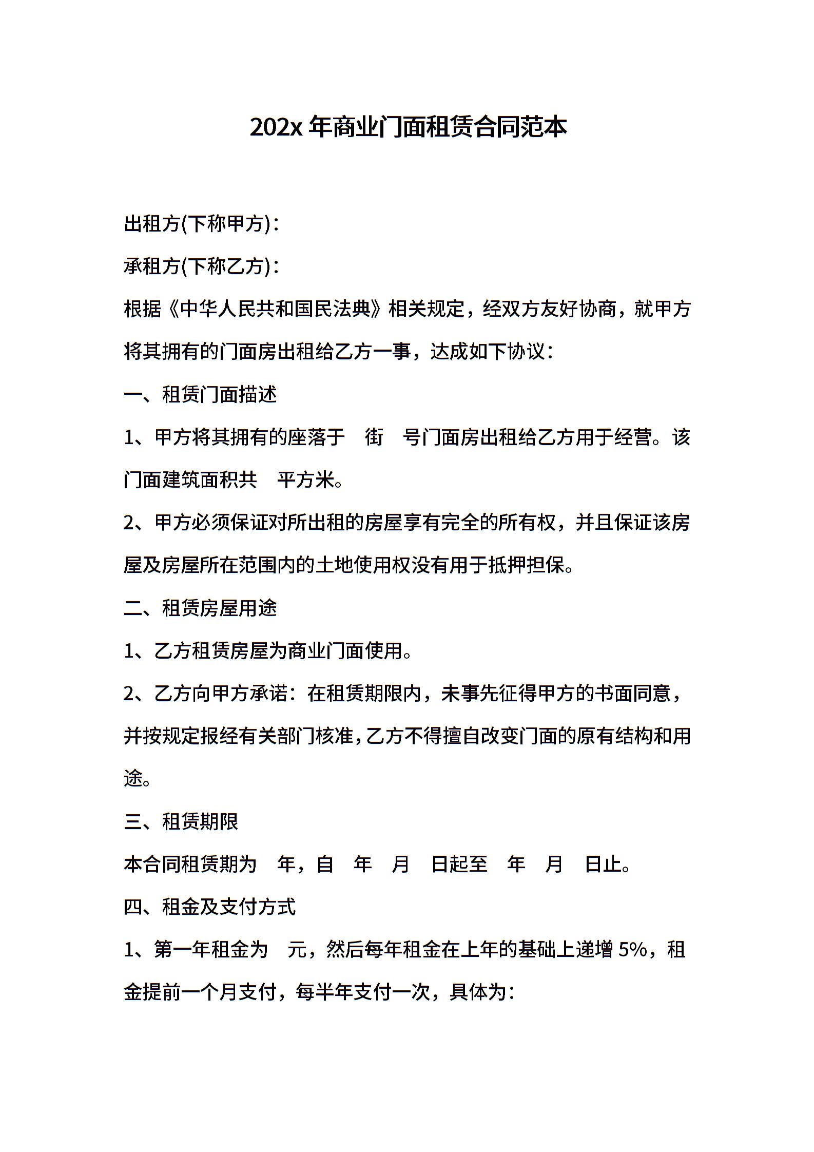 202x年商业门面租赁合同范本