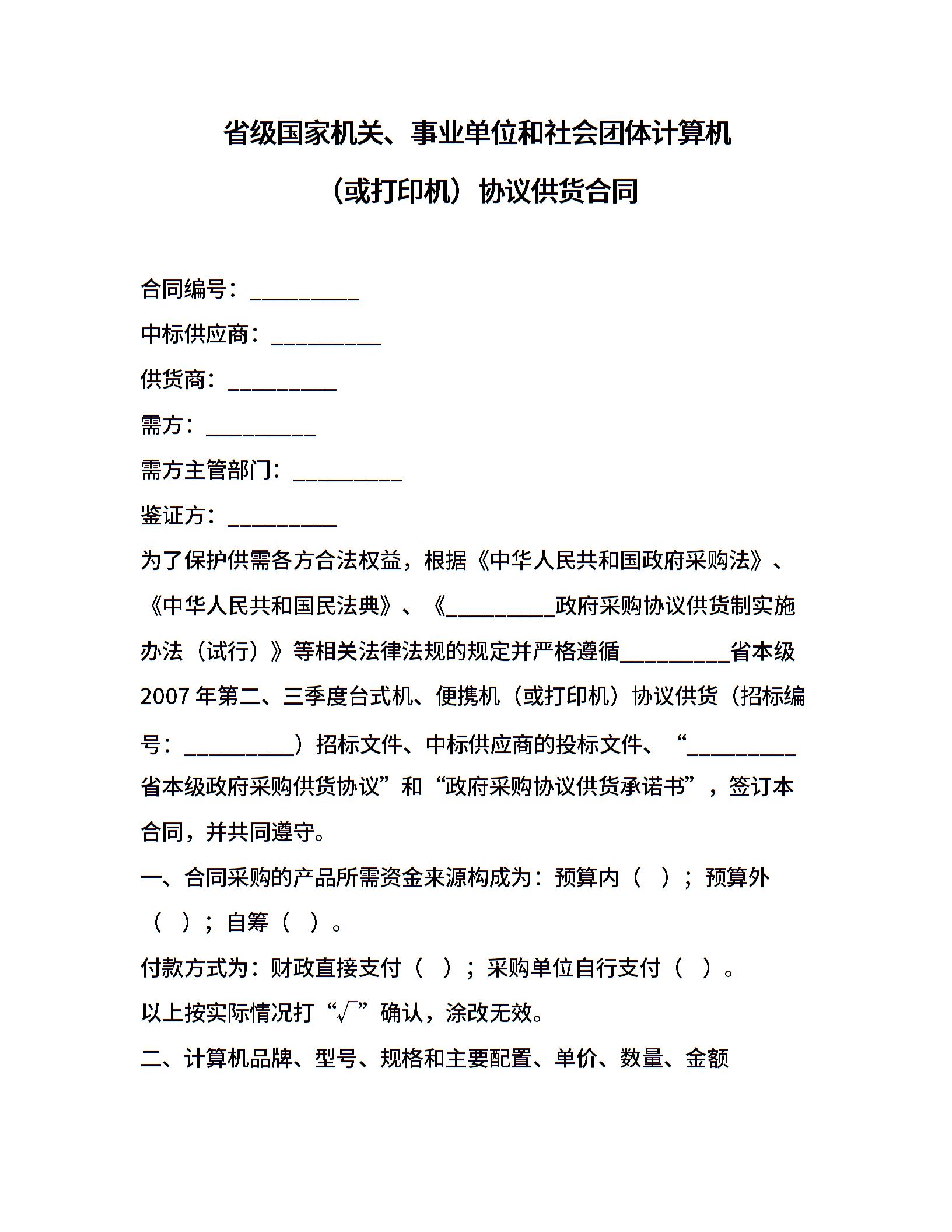 省级国家机关、事业单位和社会团体计算机(或打印机)协议供货合同(2008版)
