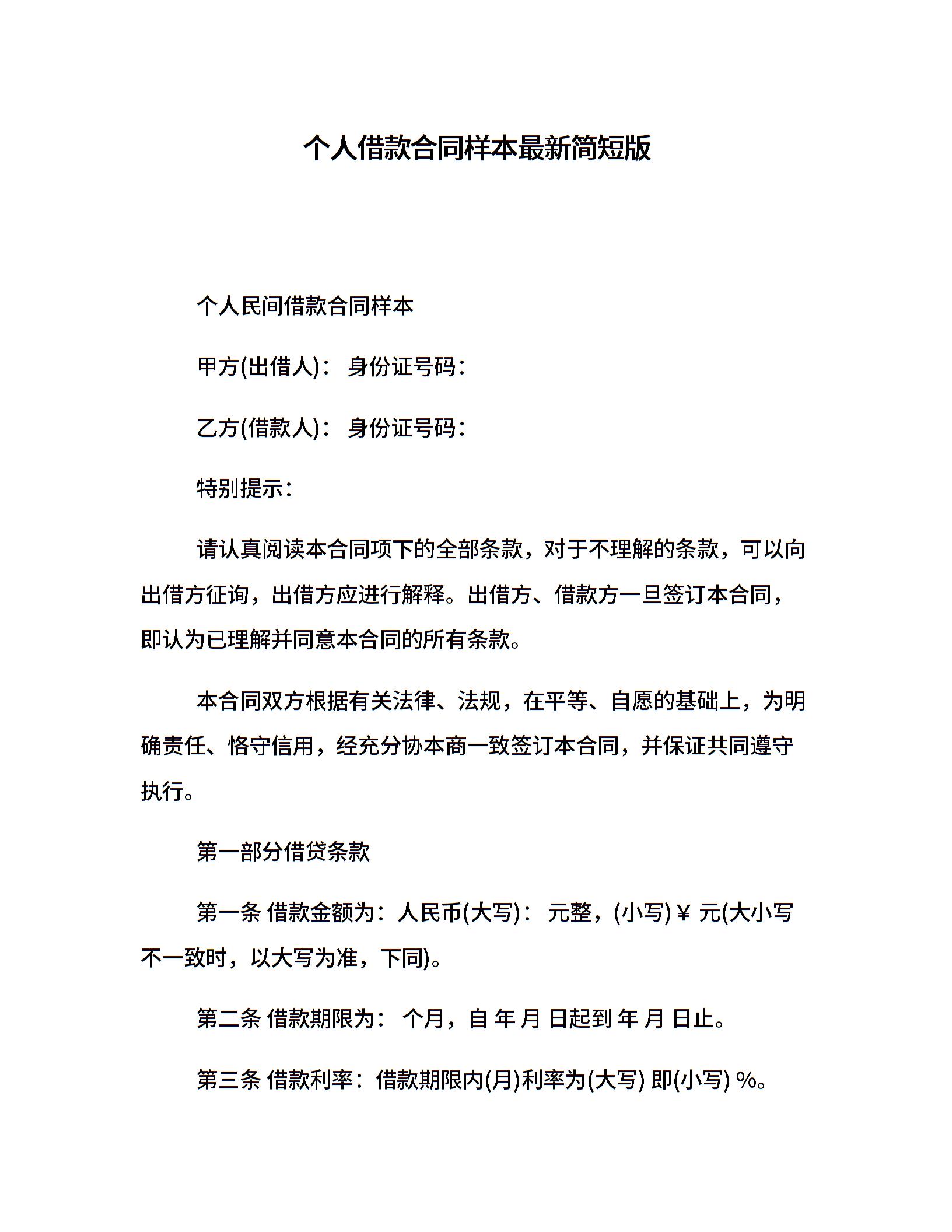 个人借款合同样本最新简短版