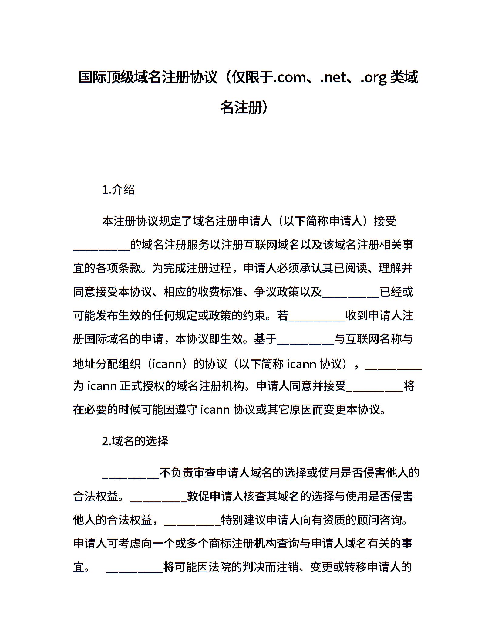 国际顶级域名注册协议(仅限于.com、.net、.org类域名注册)