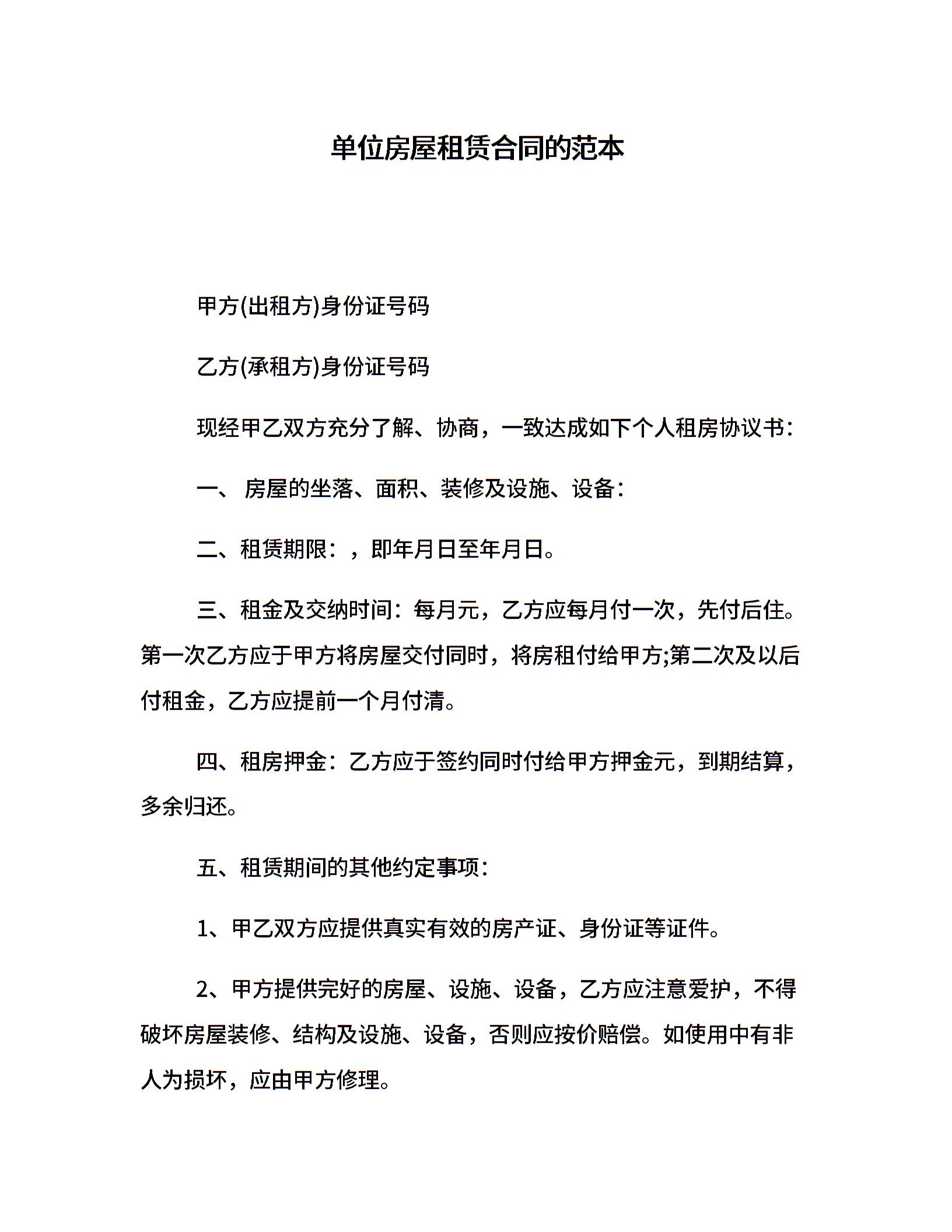 单位房屋租赁合同的范本
