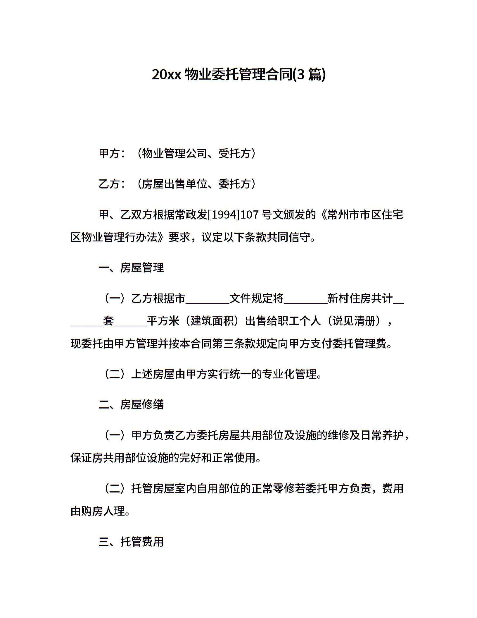20xx物业委托管理合同(3篇)