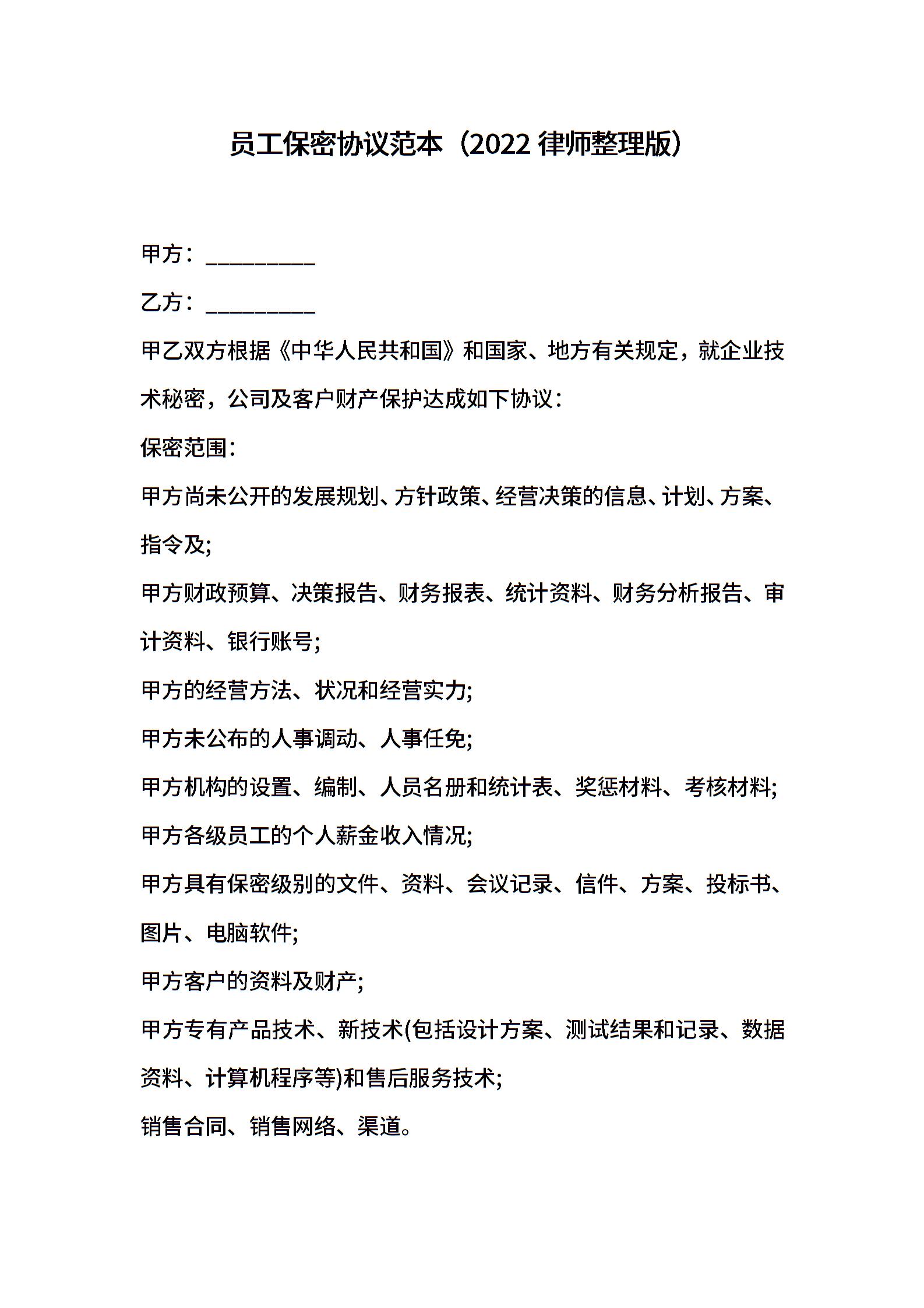 员工保密协议范本(2022律师整理版)