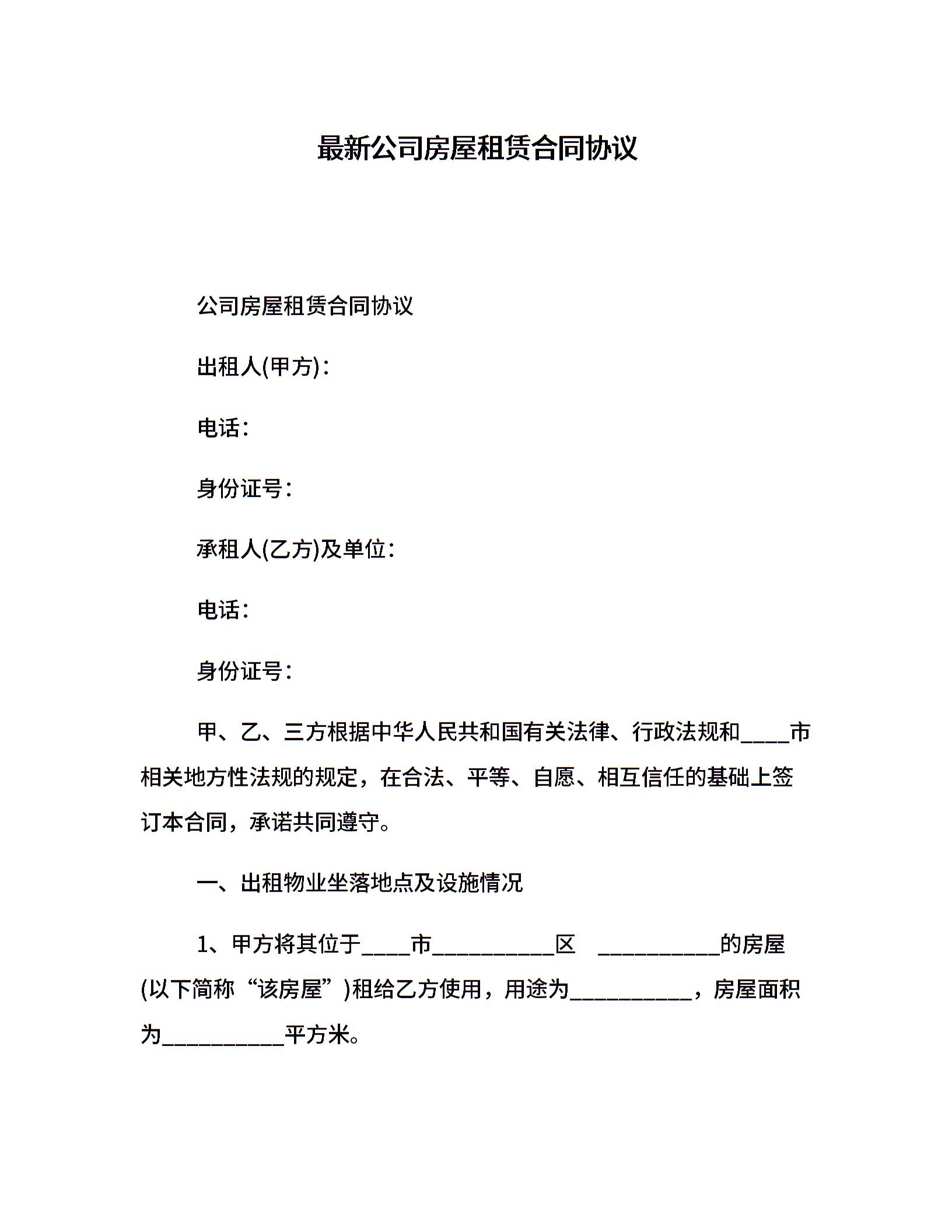 最新公司房屋租赁合同协议