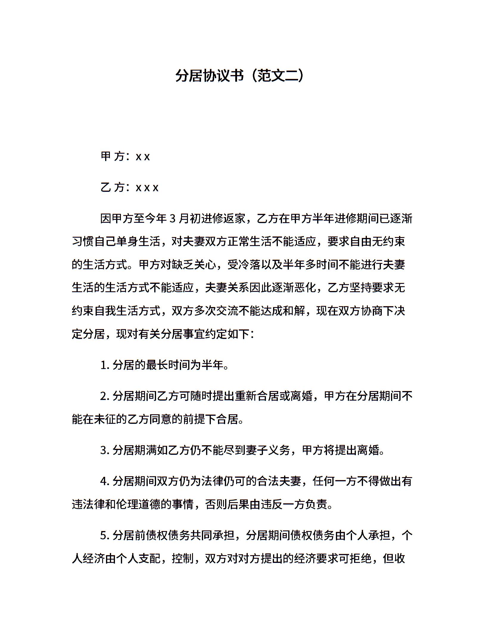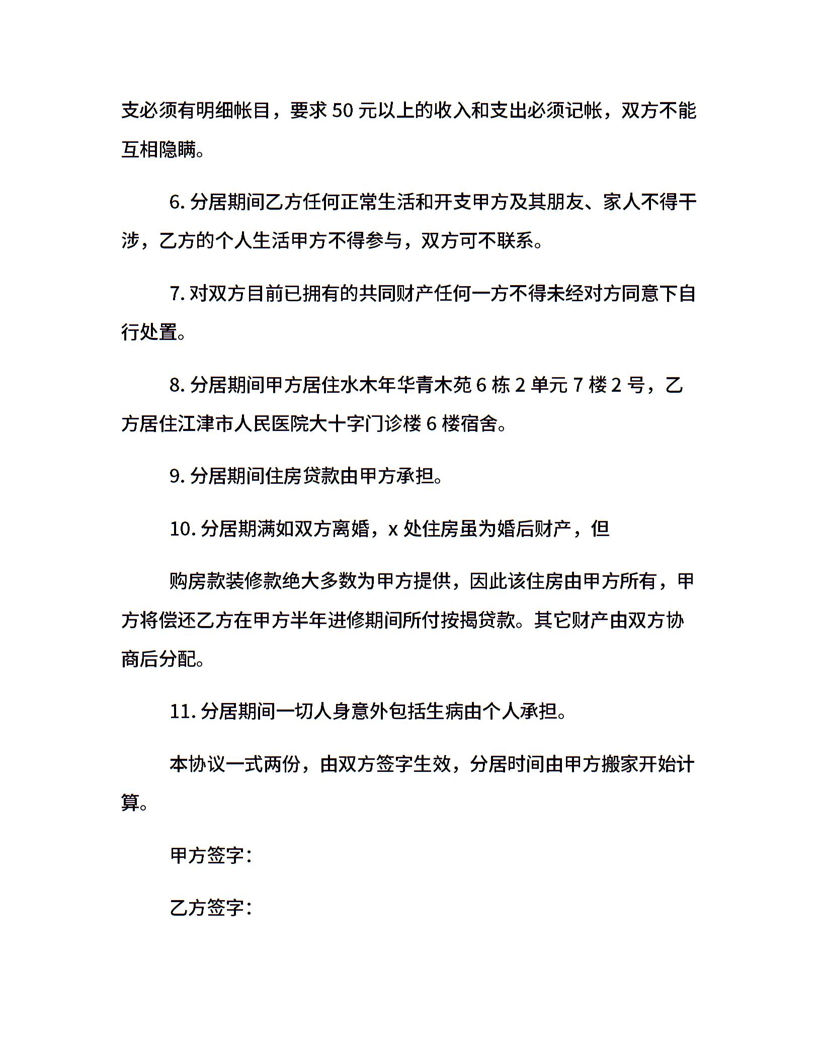 分居协议书(范文二)
