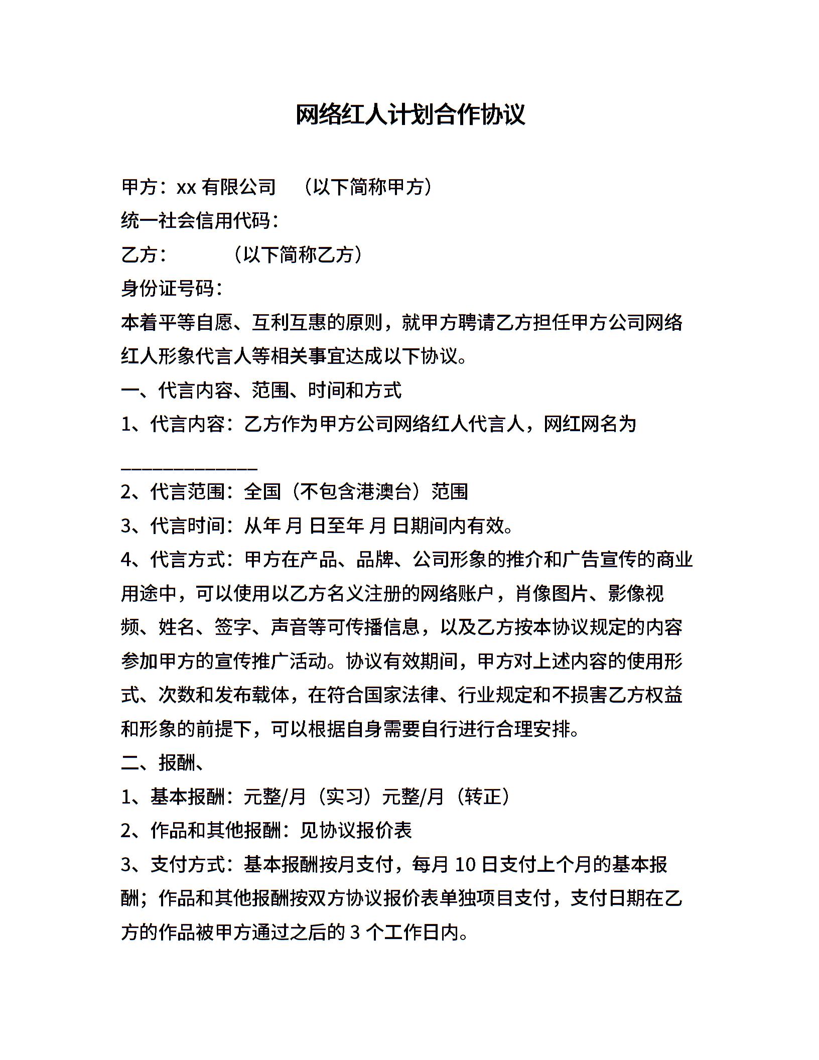 网络红人计划合作协议
