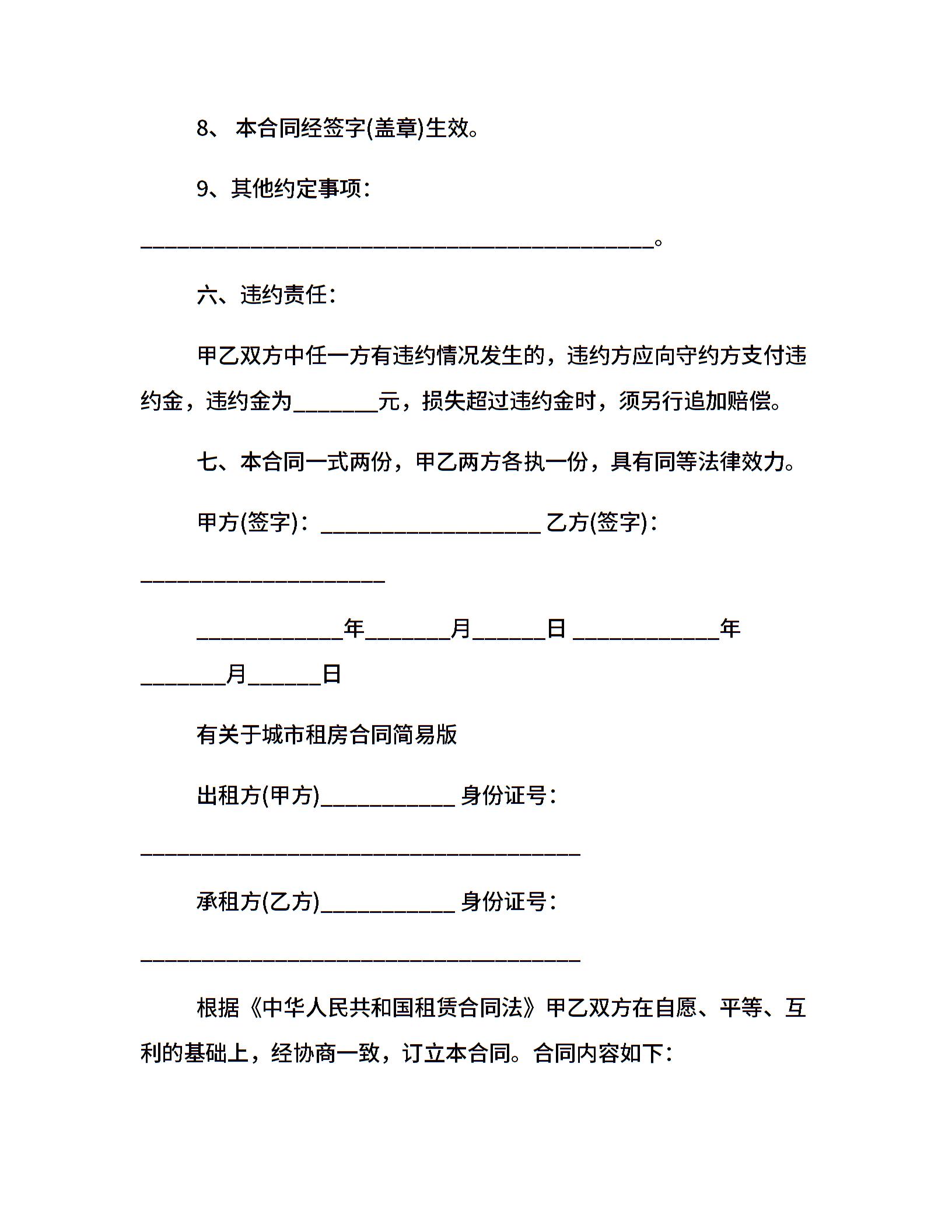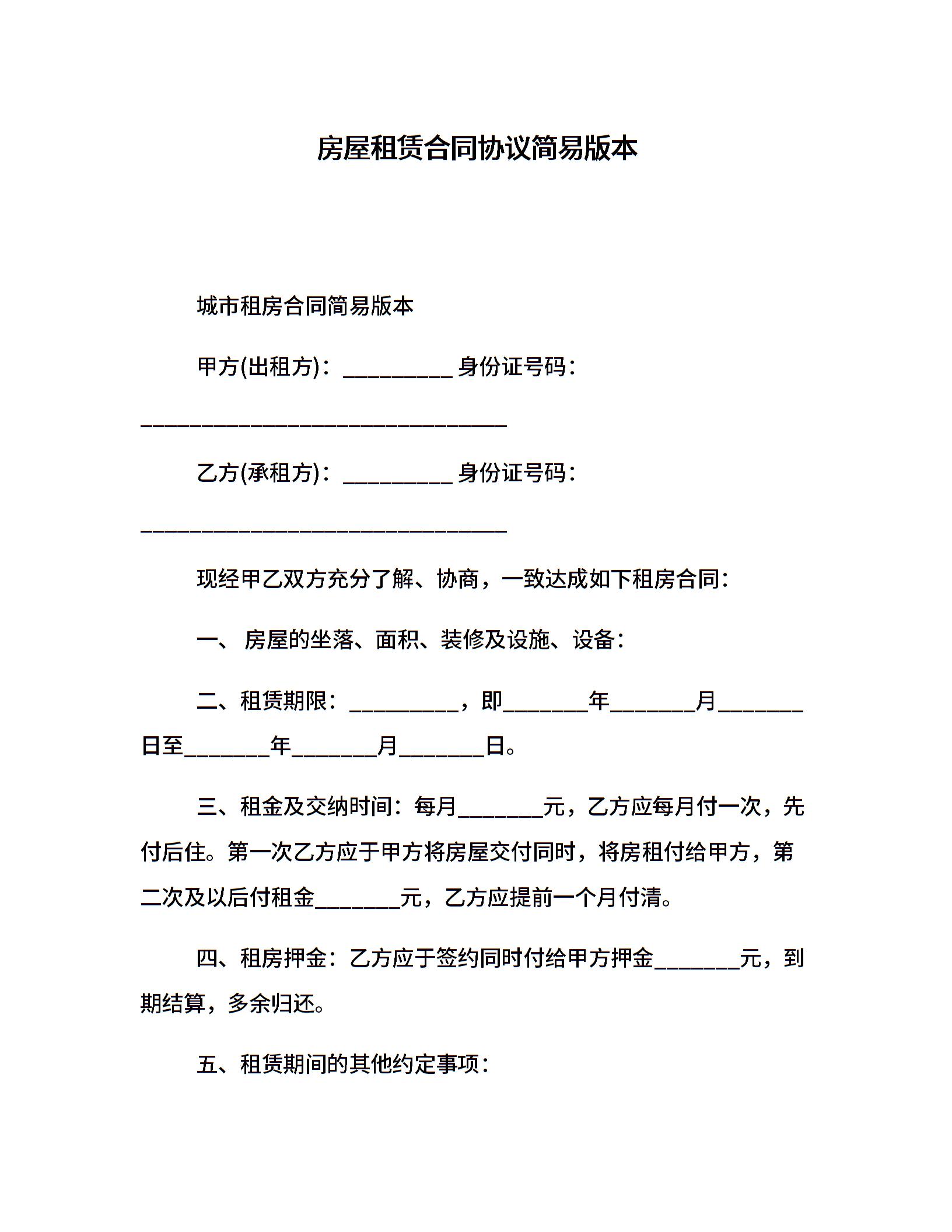 房屋租赁合同协议简易版本