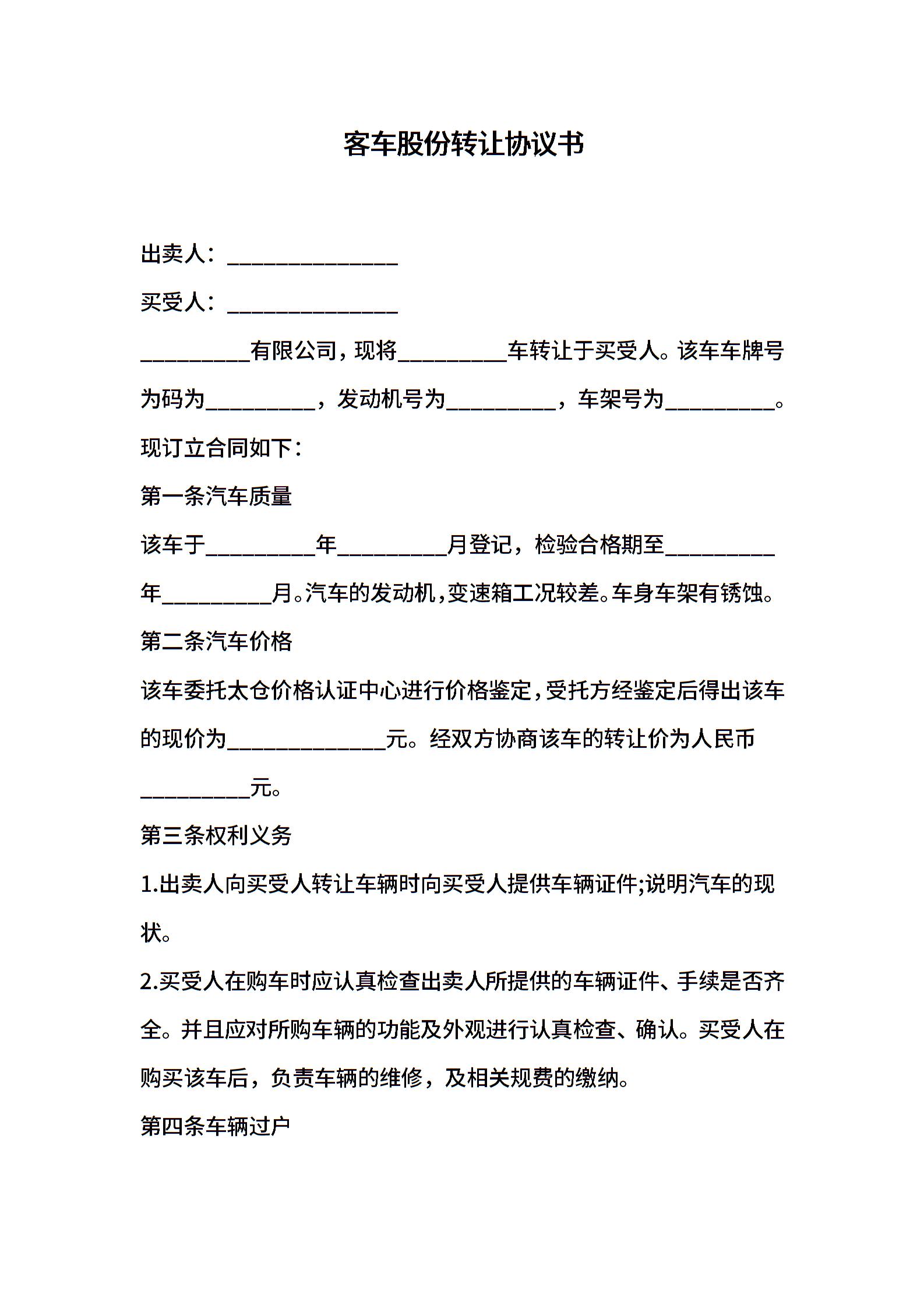 客车股份转让协议书