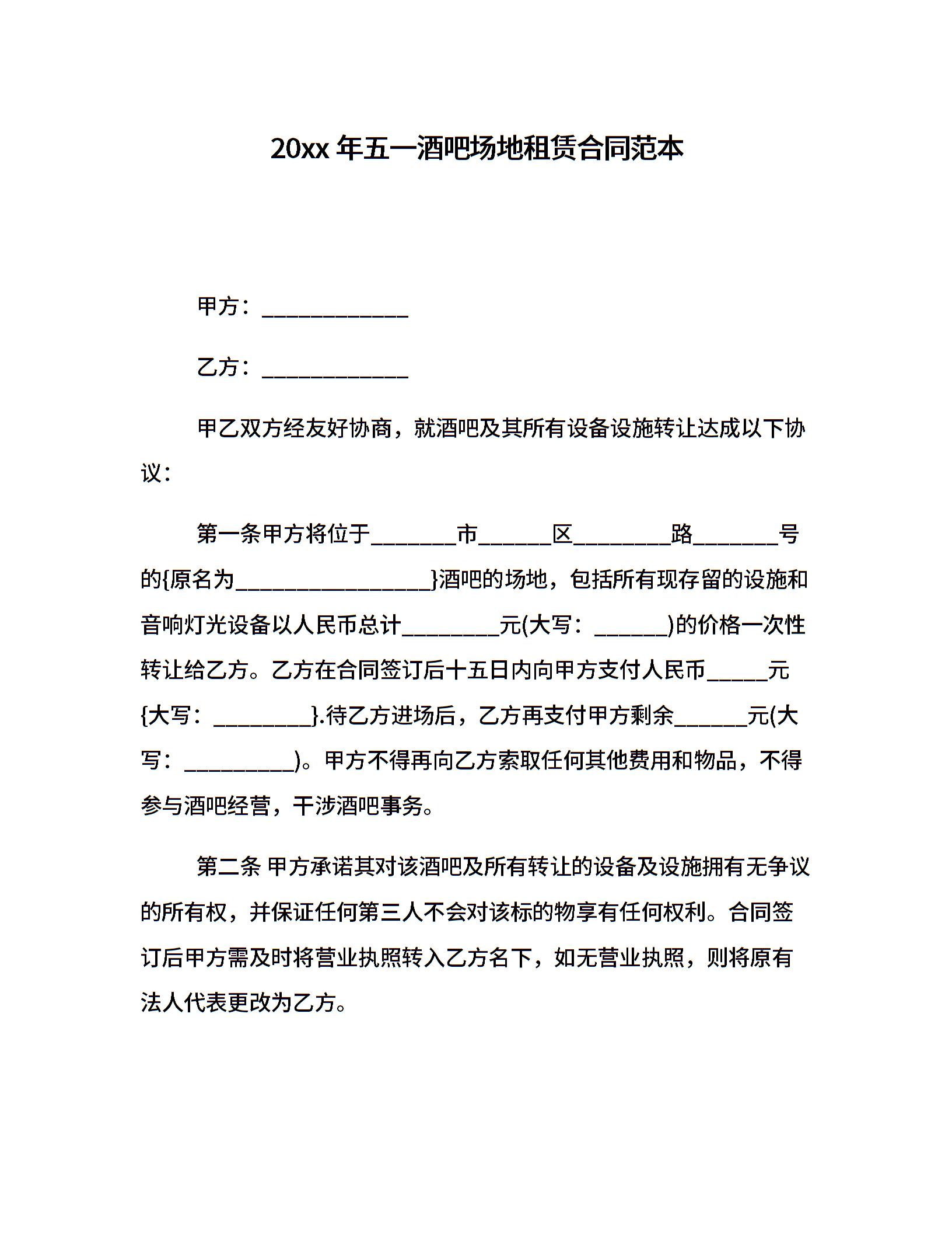 20xx年五一酒吧场地租赁合同范本