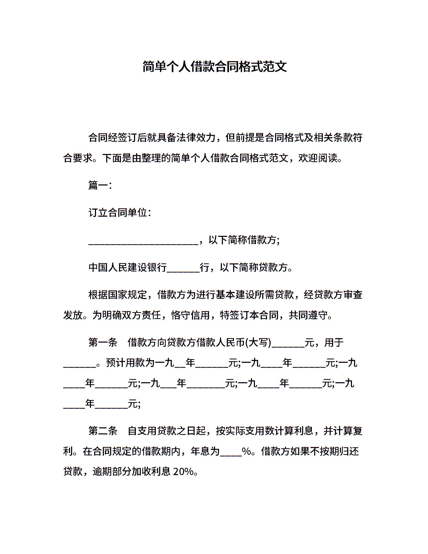 简单个人借款合同格式范文