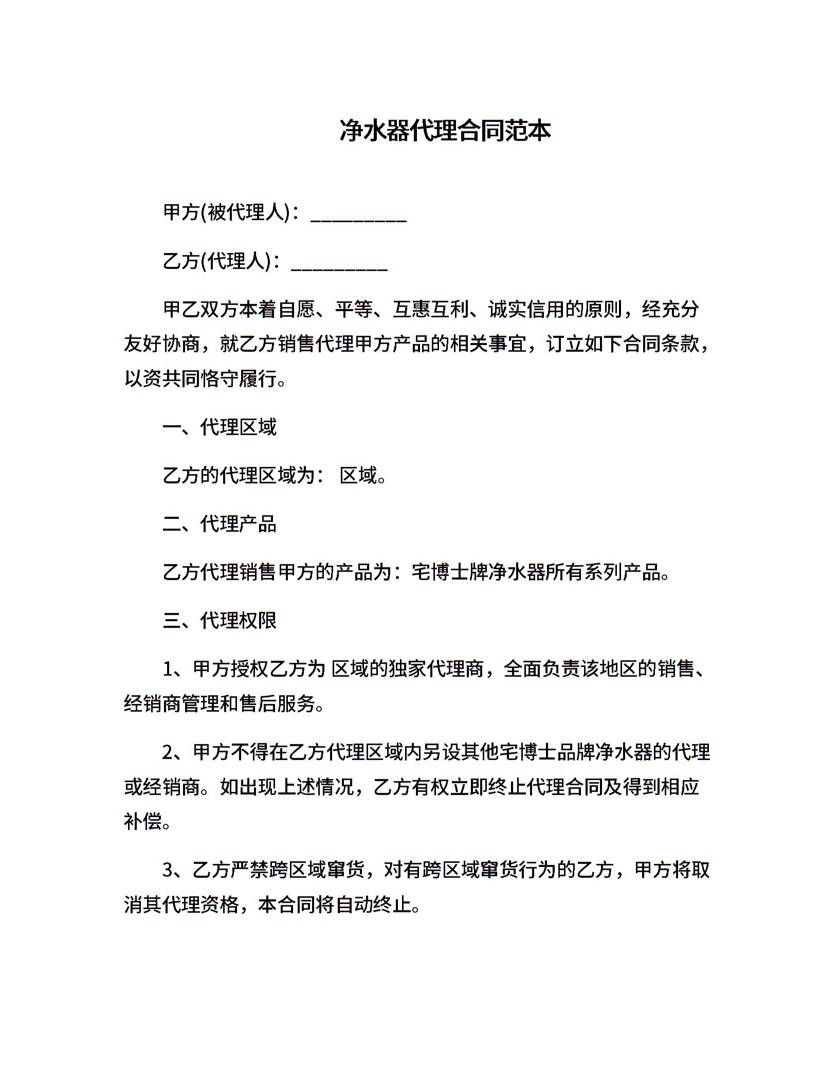 净水器代理合同范本
