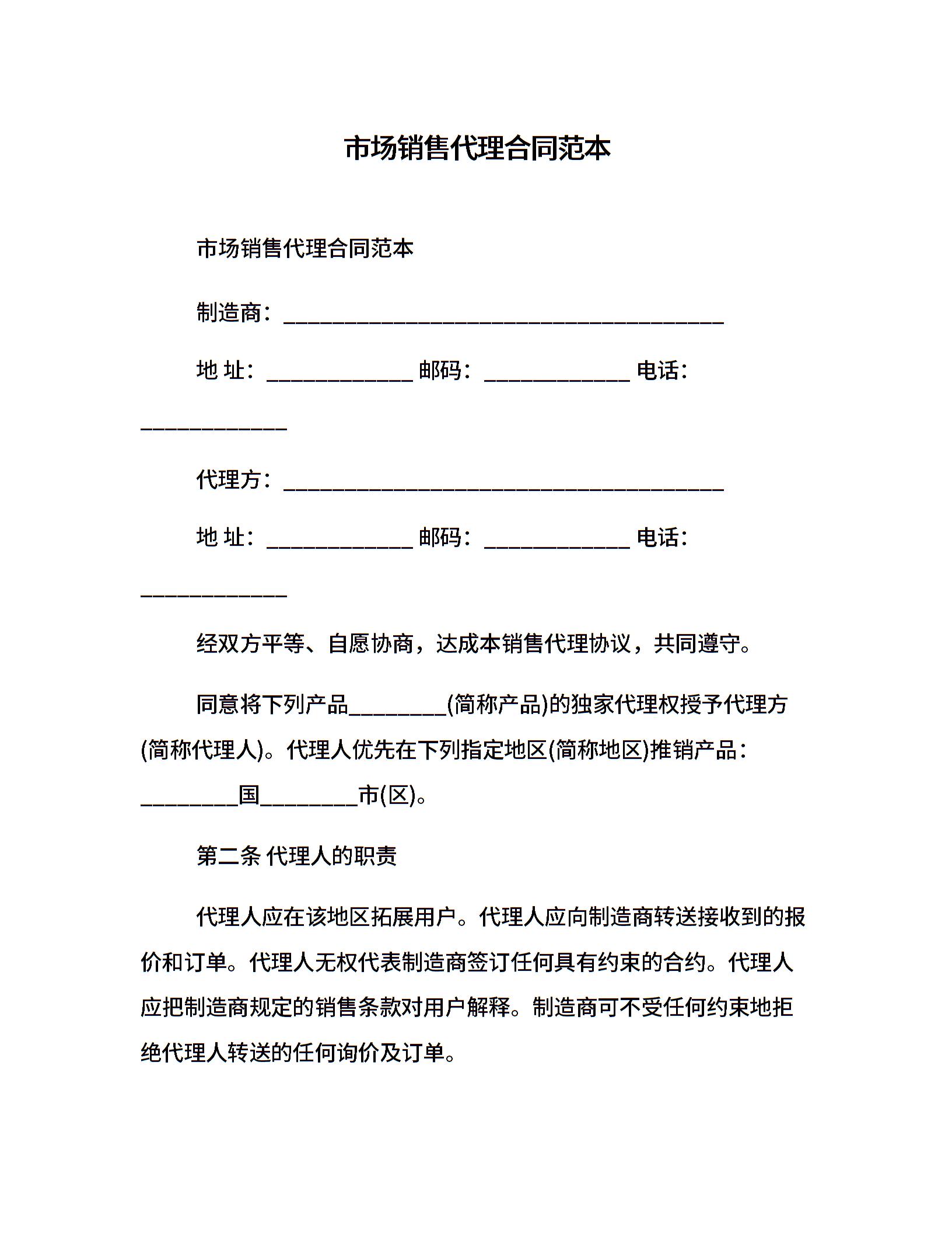 市场销售代理合同范本