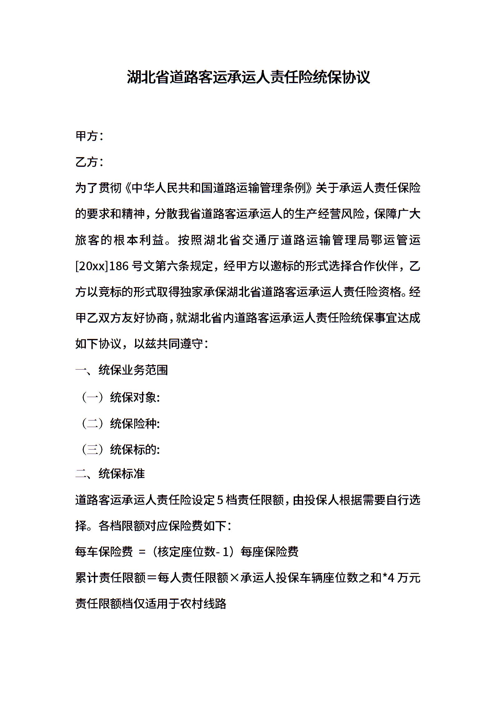 湖北省道路客运承运人责任险统保协议