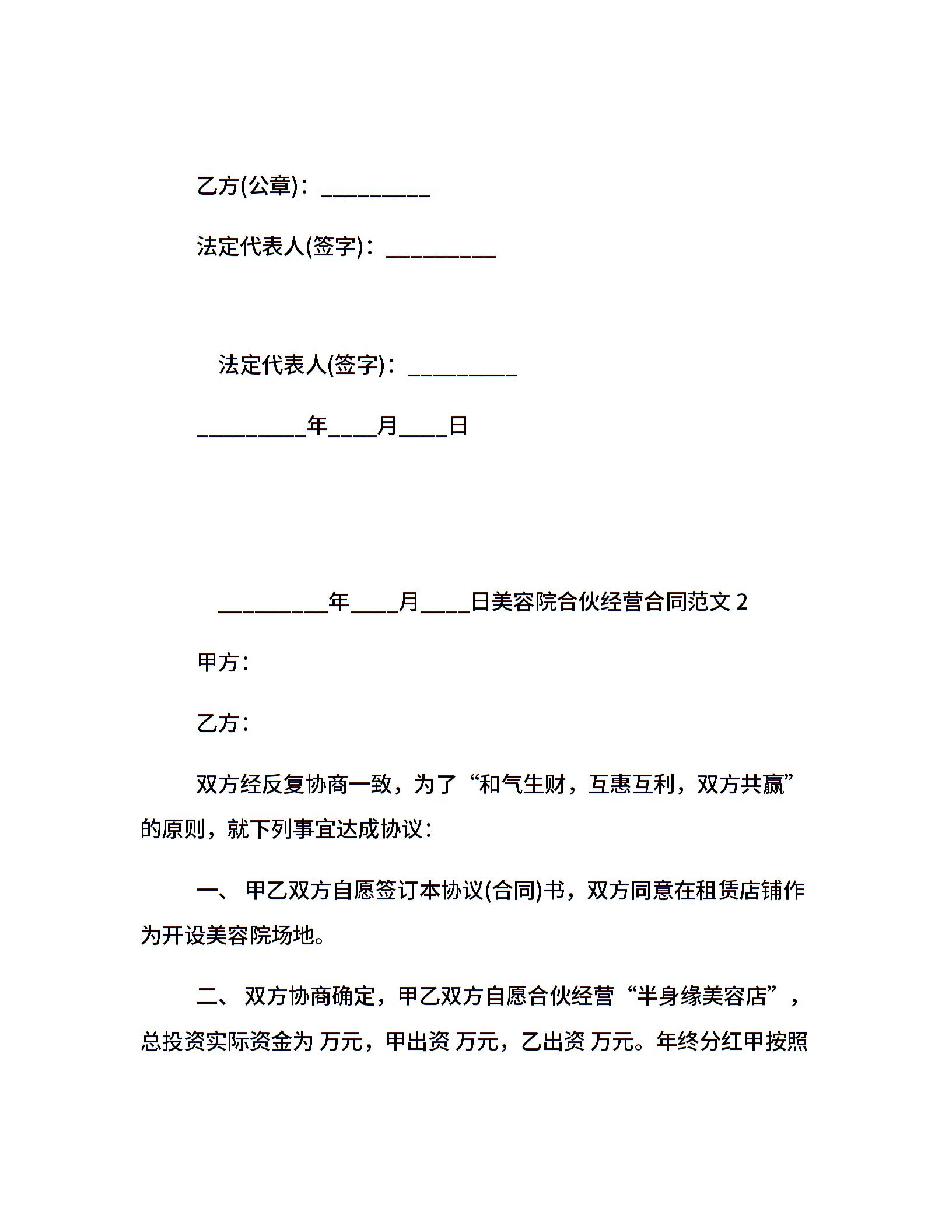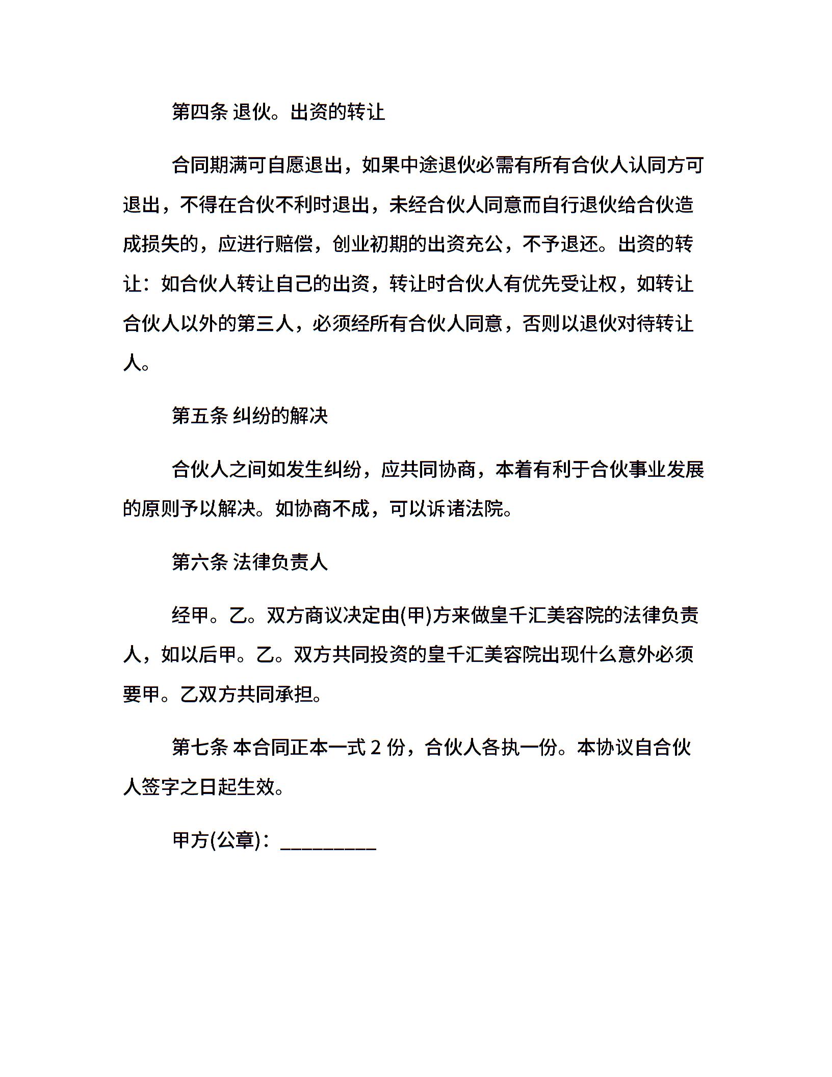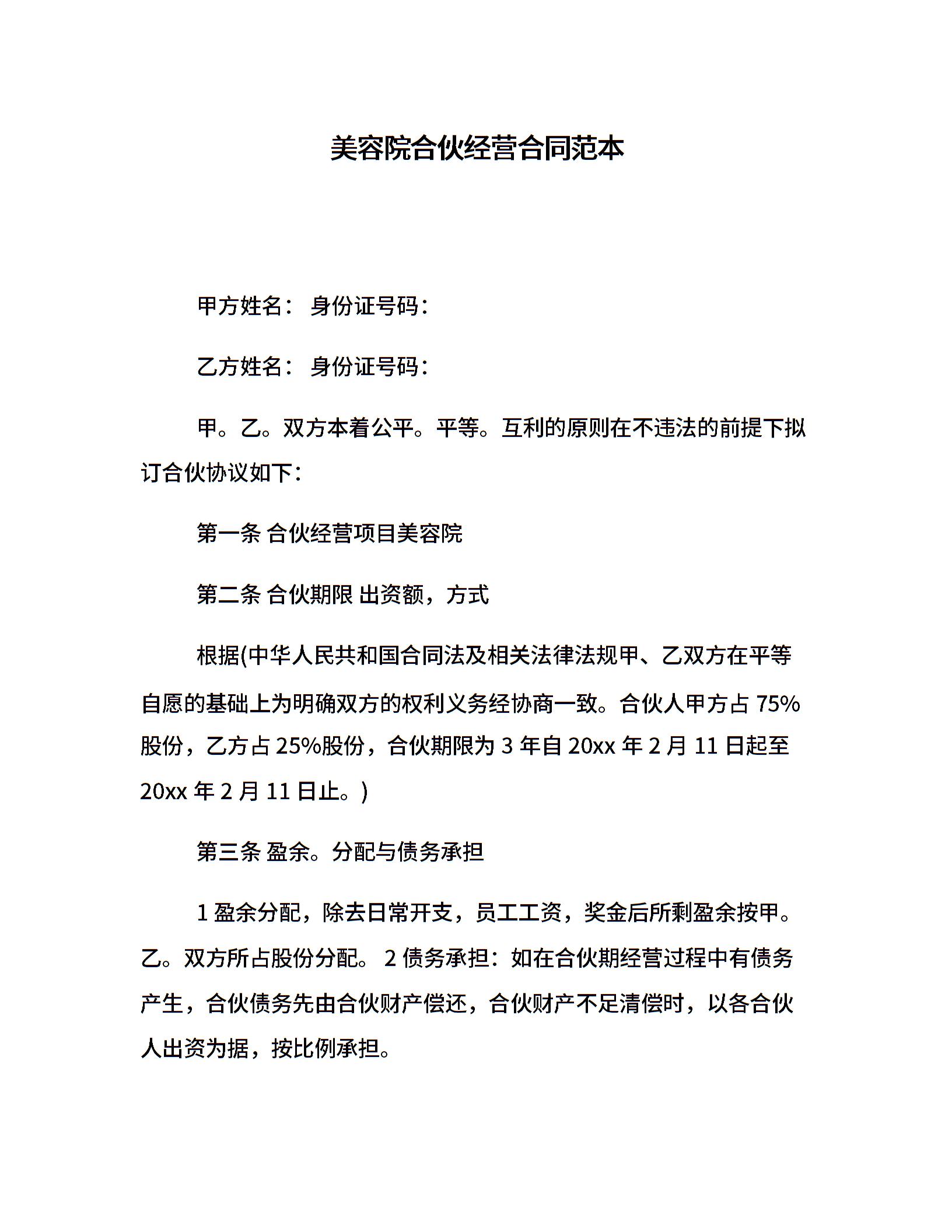 美容院合伙经营合同范本