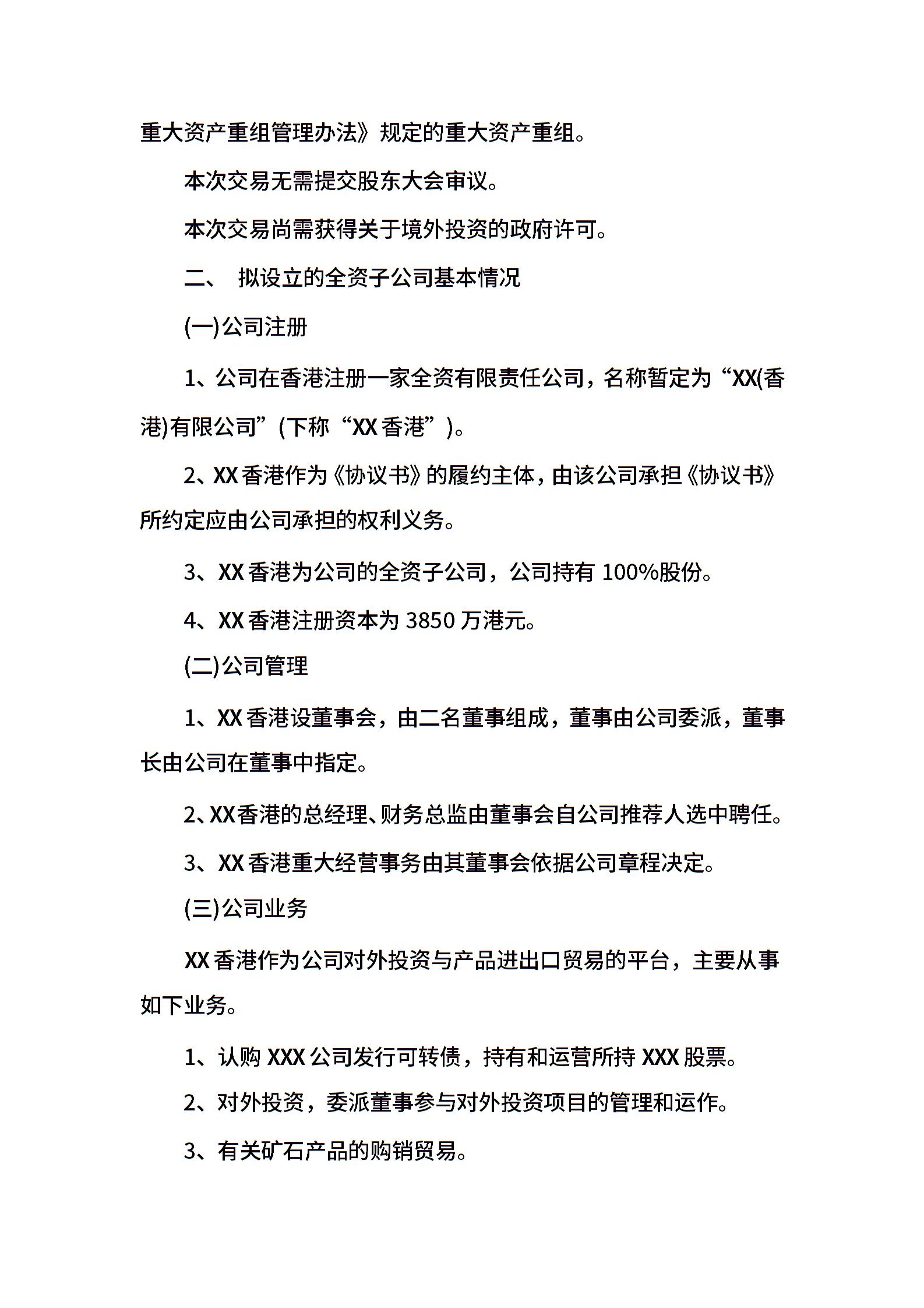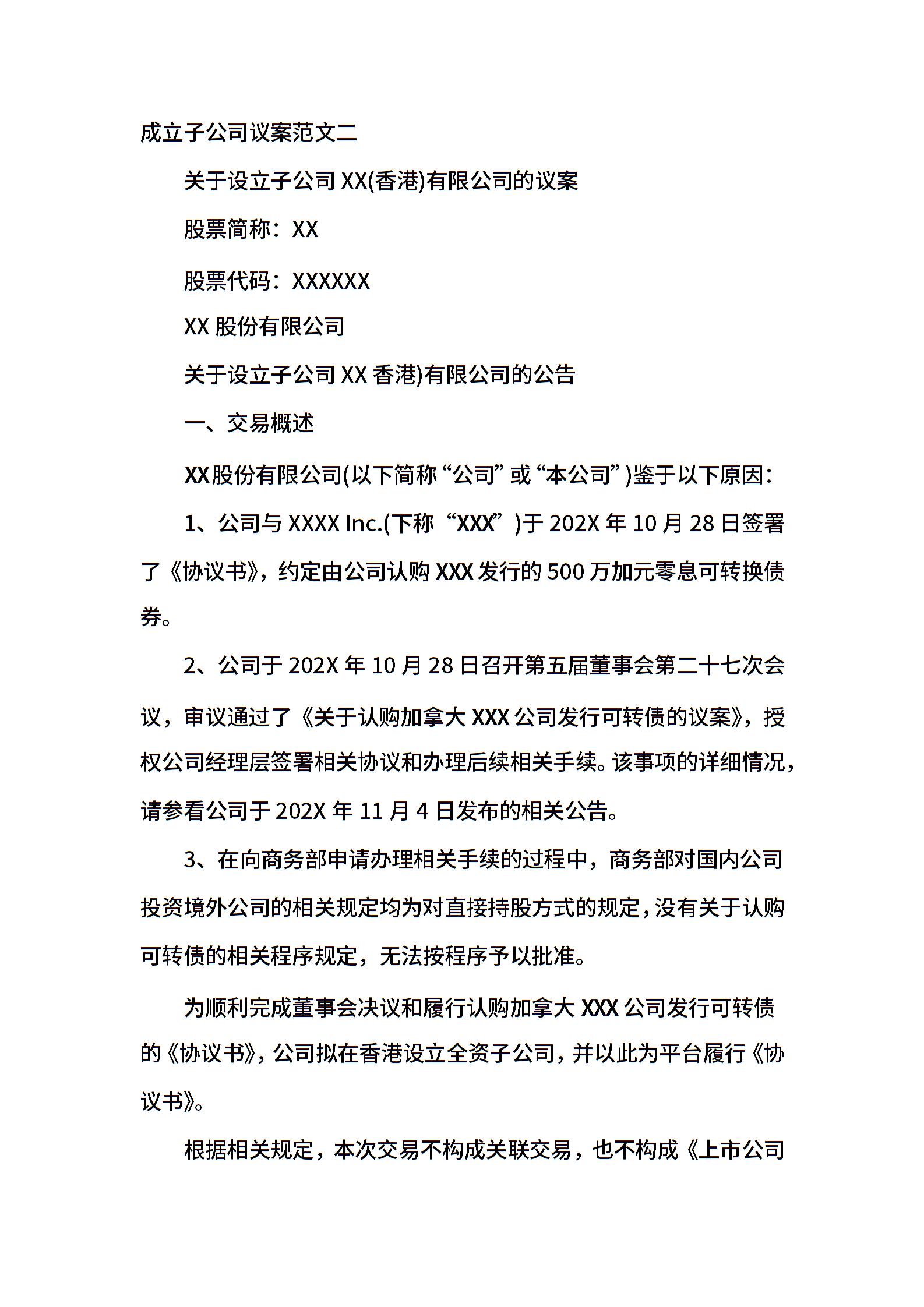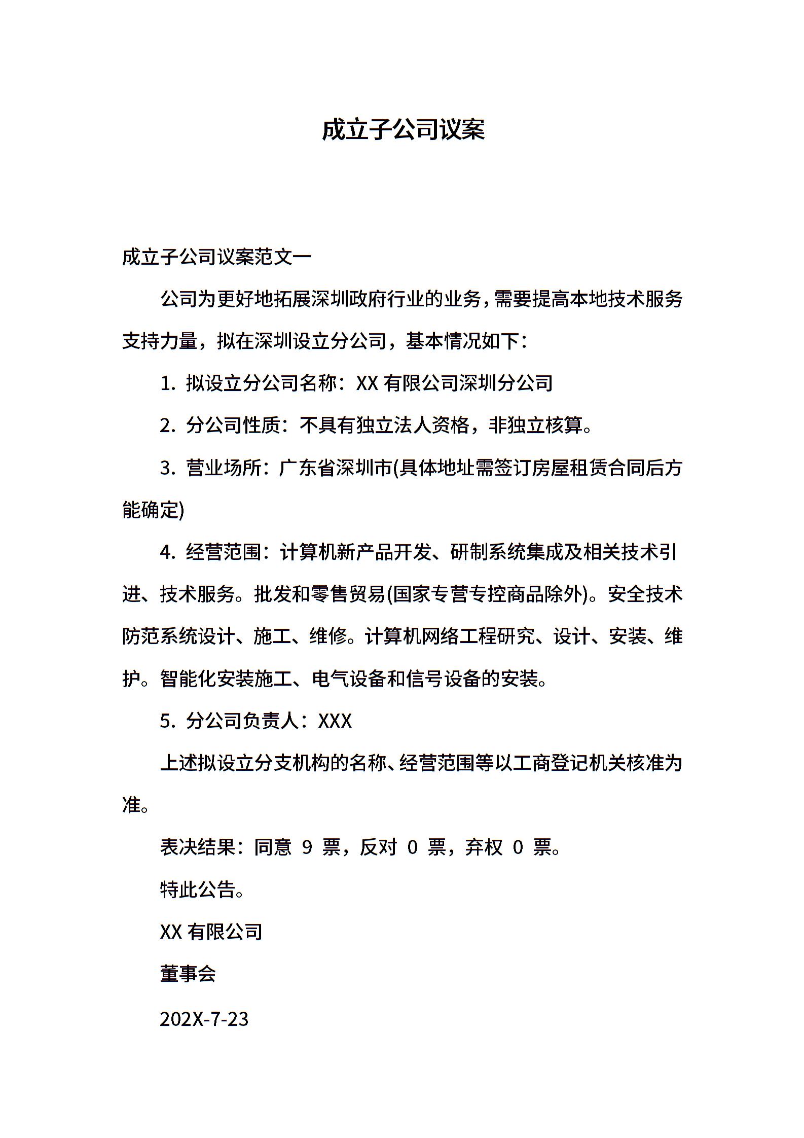 成立子公司议案