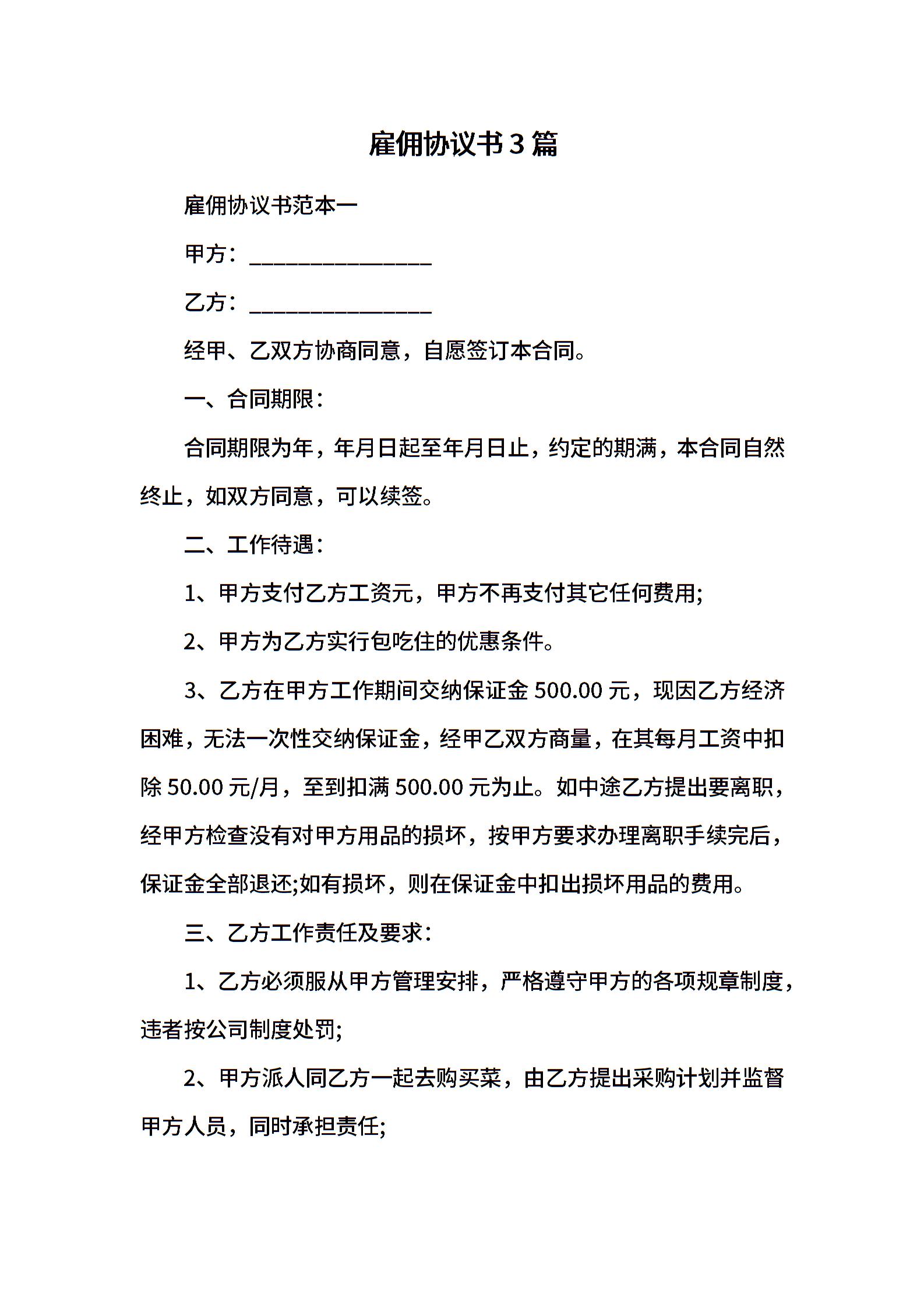雇佣协议书3篇