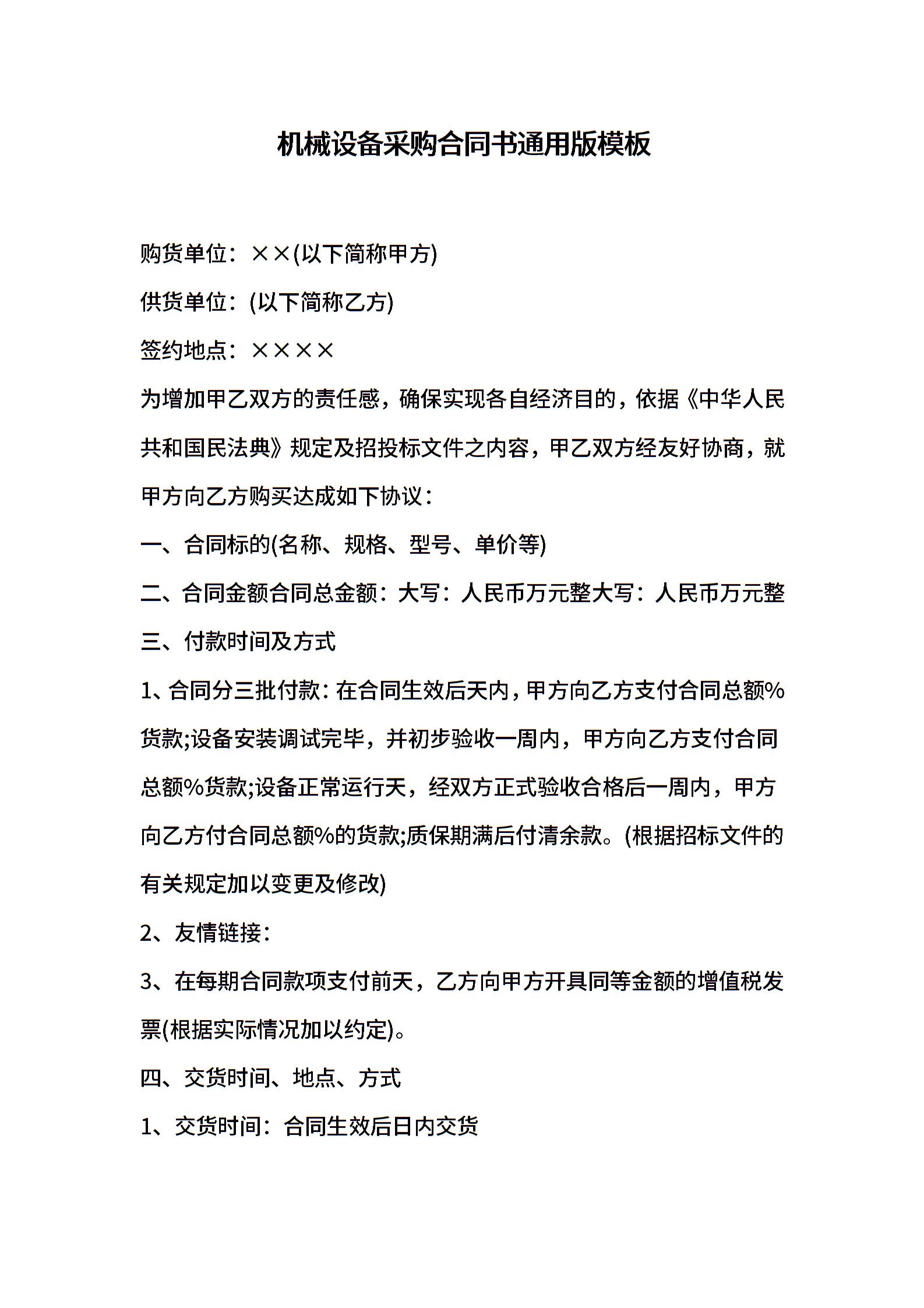 机械设备采购合同书通用版模板