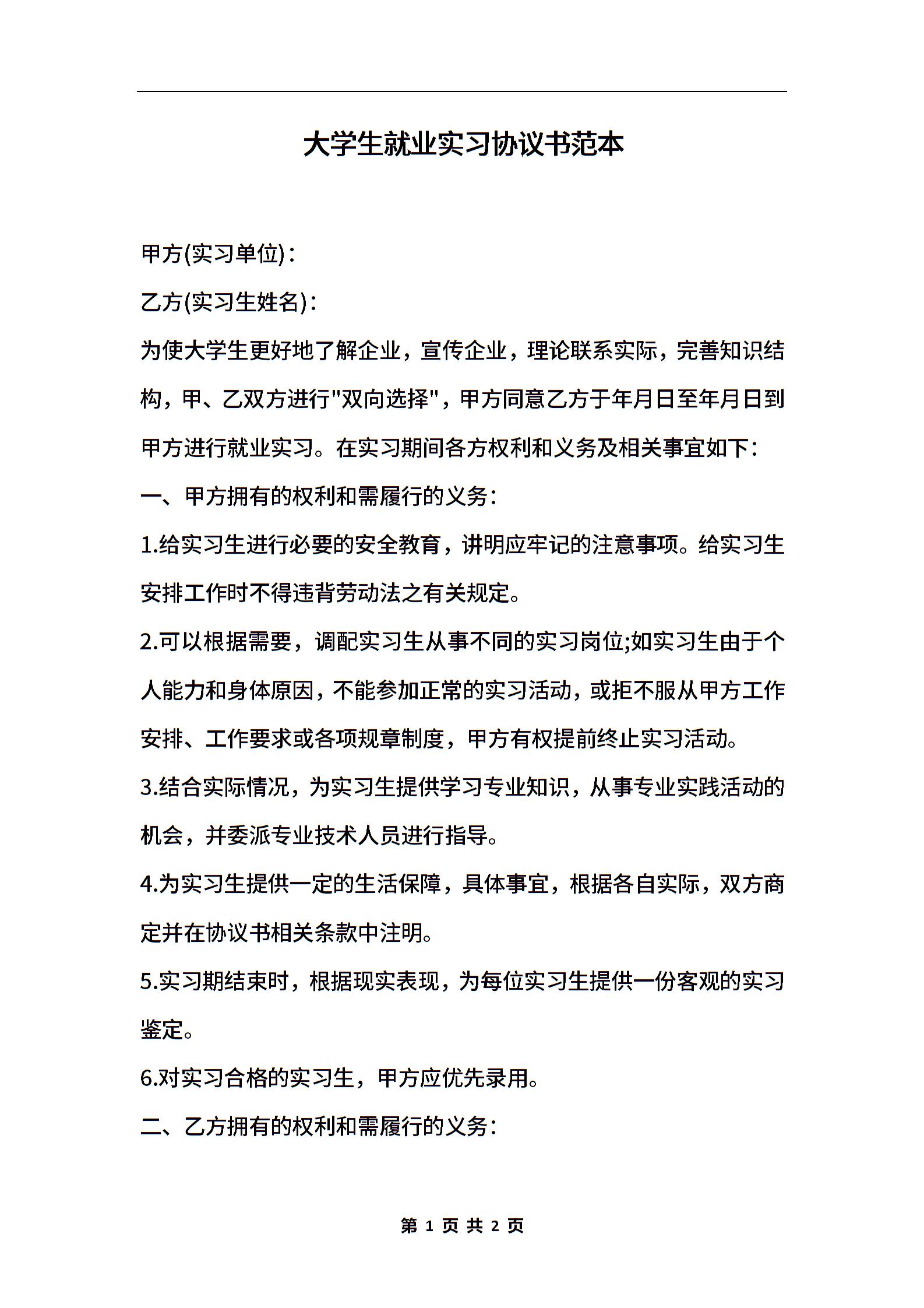 大学生就业实习协议书范本