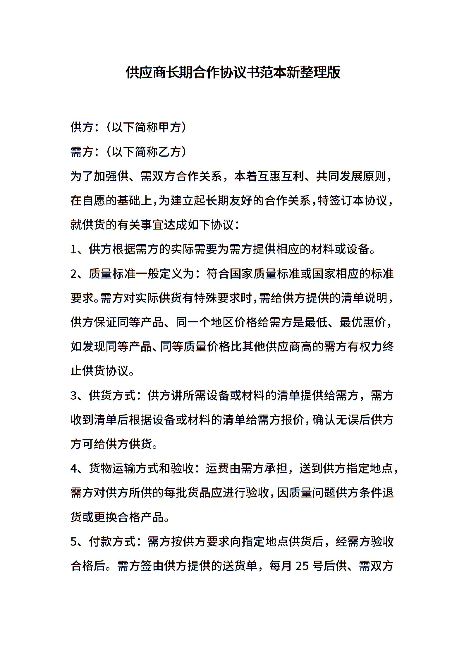 供应商长期合作协议书范本新整理版